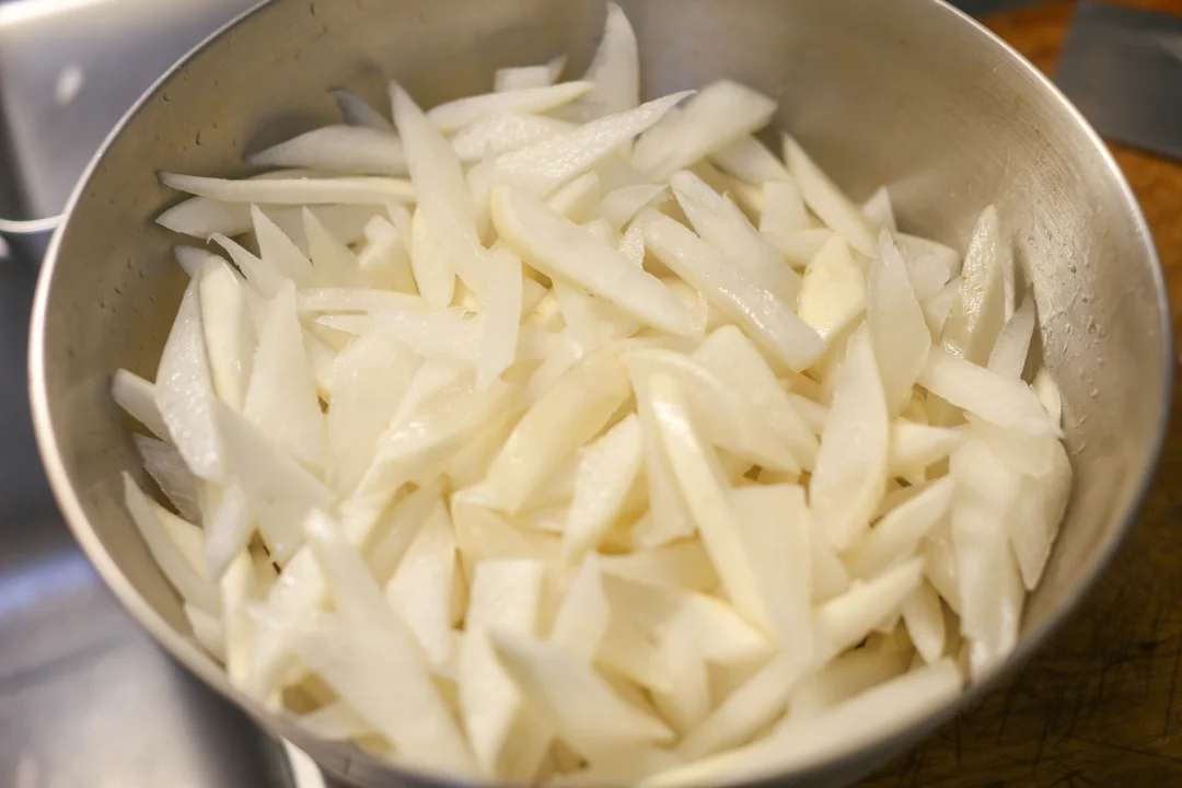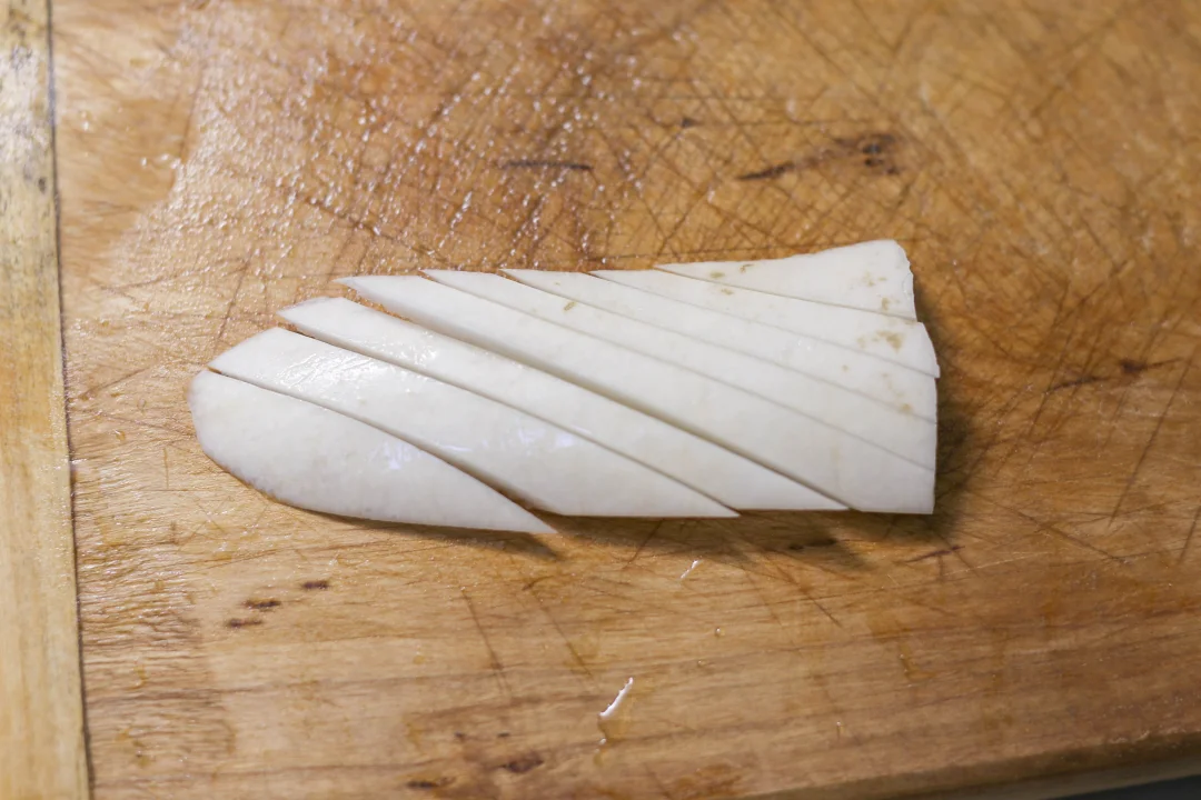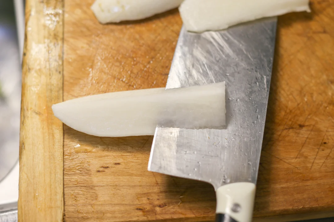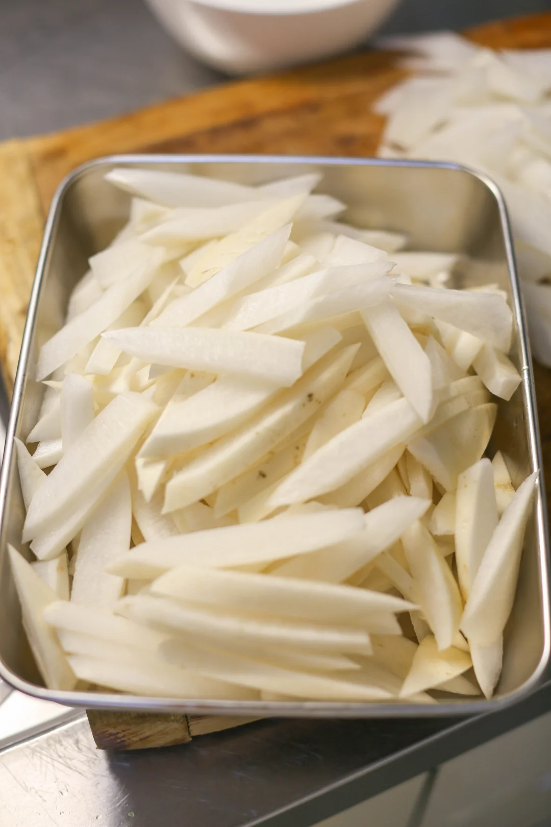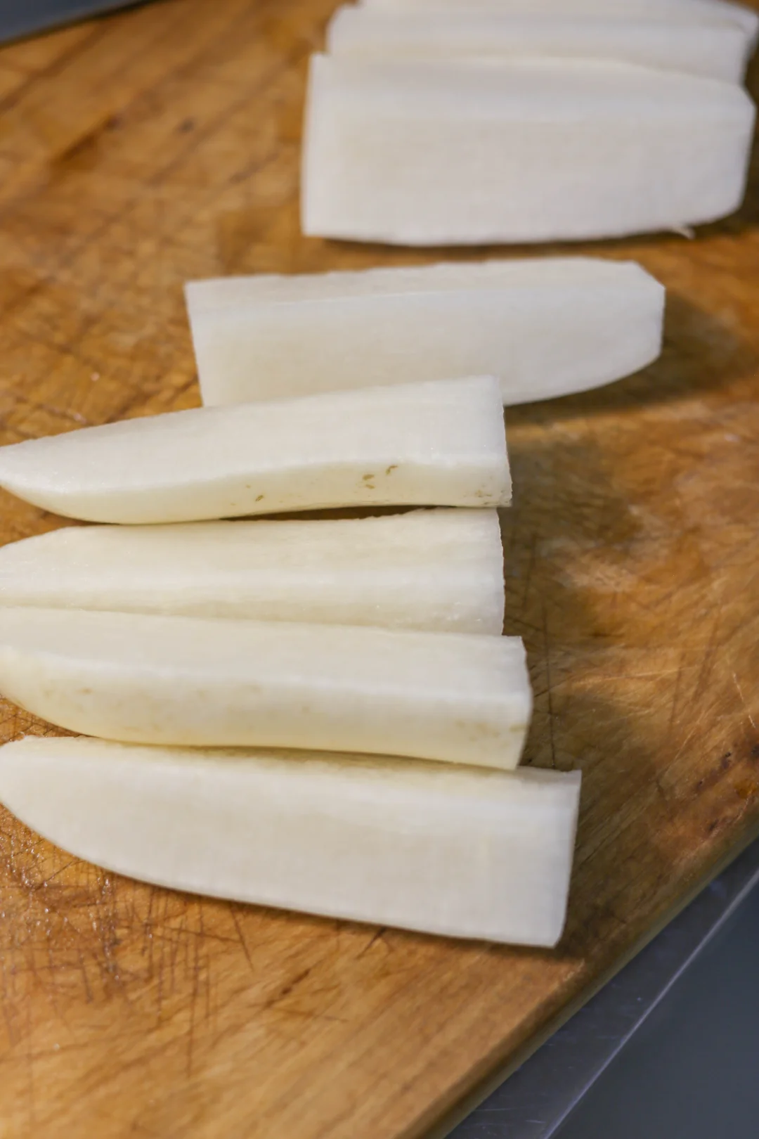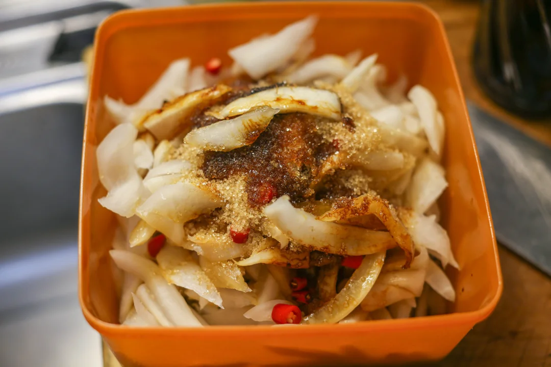 白萝卜三根,1切2,2切4,把中间的芯用到切走,萝卜皮和萝卜芯斜到切长片,100克粗盐,杀出水分,有足够的底味,腌制一个小时。 家里的常规炒勺为准: 2勺味极鲜酱油 2勺白醋 半勺老抽 1勺白糖 适量小米辣 腌制好的萝卜长条控干水分,倒入以上料汁拌匀,腌制6个小时以上,冰箱冷藏保存。 红润通透,不管是喝稀饭、吃面条都是非常好的下饭小凉菜,脆爽开胃。
