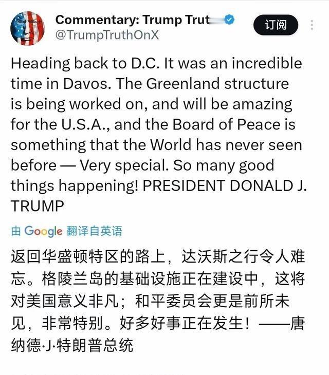 刚刚,又传来特朗普的七个重磅消息!一,特朗普1月23日写道:“返回华盛顿特区的路上,达沃斯之行令人难忘。格陵兰岛的基础设施正在建设中,这将对美国意义非凡;和平委员会更是前所未见,非常特别。好多好事正在发生!” 二,特朗普22日在瑞士达沃斯接受美国福克斯新闻频道采访时称,不会为获得格陵兰岛支付任何费用,美国将取得对这一地区的“全面准入权限”。这一“全面准入权限”是“不会结束、没有时间限制的”。“全面准入权限”意味着美国可以在格陵兰岛上“部署我们需要的任何东西”,但美国不会为此支付任何费用,因为“我们谈论的是国家安全和国际安全”。美国要在格陵兰岛部署“金穹”导弹防御系统,这是美国唯一的付出。 三,普京表示愿意向和平委员会提供10亿美元,不过这些钱要从“被美国政府冻结的俄罗斯资产”里面出。特朗普1月22日被记者问及相关问题时说,这非常有意思。“如果他肯用自己的钱,我认为还挺好的。”“他将加入‘和平委员会’,并捐赠10亿美元。如果他用的是自己的钱,那还挺好。” 四,22日特朗普在空军一号上对记者说:“我4月将访问中国,我们一直保持着良好的关系,冠病疫情期间,中美关系一度紧张,但此后已显著改善,中国正在大量购买美国大豆,这对美国农民来说是件好事......” 五,特朗普22日表示,美军正大规模向伊朗方向进行军事调遣。同时,他表示期望伊朗局势保持稳定,称但愿伊朗不要生出事端。 六,特朗普美东时间周四晚在Truth Social发帖说:“创纪录的数据无处不在!我应该试下第四个任期吗?” 七,特朗普1月22日在社交媒体上发文说:“或许我们应该考验一下北约:启动第5条,迫使北约前来保护我们的南部边境,防止非法移民进一步入侵,从而腾出大量边境巡逻人员执行其他任务。” 这七条消息一出来,很多人直接看傻了。特朗普刚从达沃斯回来,就连发这些内容,节奏快得像不要钱一样。格陵兰岛那件事从他第一次提收购开始就闹得沸沸扬扬,现在直接说不花钱就能拿到“全面准入权限”,还把“金穹”导弹防御系统当筹码扔出去,听着像极了他在地产圈谈项目时的套路:我给你点东西,你把地盘给我用,钱?谈钱多伤感情,国家安全的事儿能用钱衡量吗? 和平委员会这个东西更离谱。特朗普自封创始主席,还能续任,等于想当多久就当多久。会员国想当常任理事?掏10亿美元,钱直接归主席支配。执行委员会里全是他的亲信和老熟人:鲁比奥、威特科夫、库什纳、布莱尔这种组合,感觉不像国际组织,倒像私人俱乐部开会。第一个任务是管加沙过渡治理,库什纳还拿PPT出来画大饼,说未来加沙要盖180栋摩天大楼,分住宅区、旅游区、工业区、农业区,十年GDP冲100亿美金,家庭年收入超1.3万刀。特朗普自己也站台说这是块好地段,开发好了大家都有钱赚。结果巴勒斯坦人根本没份儿,执行委员会里一个巴勒斯坦代表都没有,他们气得直接骂这是殖民主义翻版。 特朗普这人做事就这样,喜欢大开大合,退群是他的拿手好戏,上台一年多退了六十多个国际组织,现在又自己搞一个新组织,主席位子先占着,钱先收着,规则自己定。那些小国和中东国家签字也现实,拒绝得罪美国后果太重,法国敢硬刚,他们可不敢。蒙古国、越南这种跟加沙八竿子打不着的都跑去签了,纯粹是政治生存算计。 格陵兰岛这边更现实。丹麦和格陵兰当地人抗议不断,美国国会两党都跳出来挡特朗普的关税威胁,说不能这么乱来。特朗普后来改口,说找到让北约满意的方案,关税先暂停,但“金穹”部署和矿产准入这些事儿还在谈。伊朗方向美军调动规模不小,他又说希望别出事,典型的先摆姿态再谈条件。中国大豆采购他也拿出来说事儿,关系改善了,农民赚钱了,听着像在给自己政绩加分。 Truth Social上那条问要不要第四任期,明显是试水民意。北约第五条用来管南部边境移民,更是脑洞大开,把集体防御条约当移民政策工具用。整件事看下来,特朗普的风格没变:把国际政治当生意谈,把盟友当客户谈,把规则当自己定的合同。支持者觉得他敢干、够硬气,反对者觉得这是在拆国际秩序的台。 三年后回头看,这段大概率还是会被当成国际政治里的黑色幽默。但现在看,它就是正在发生的现实。特朗普不觉得这是闹剧,他觉得这是他在改写规则。其他人信不信另说,至少他自己信。
