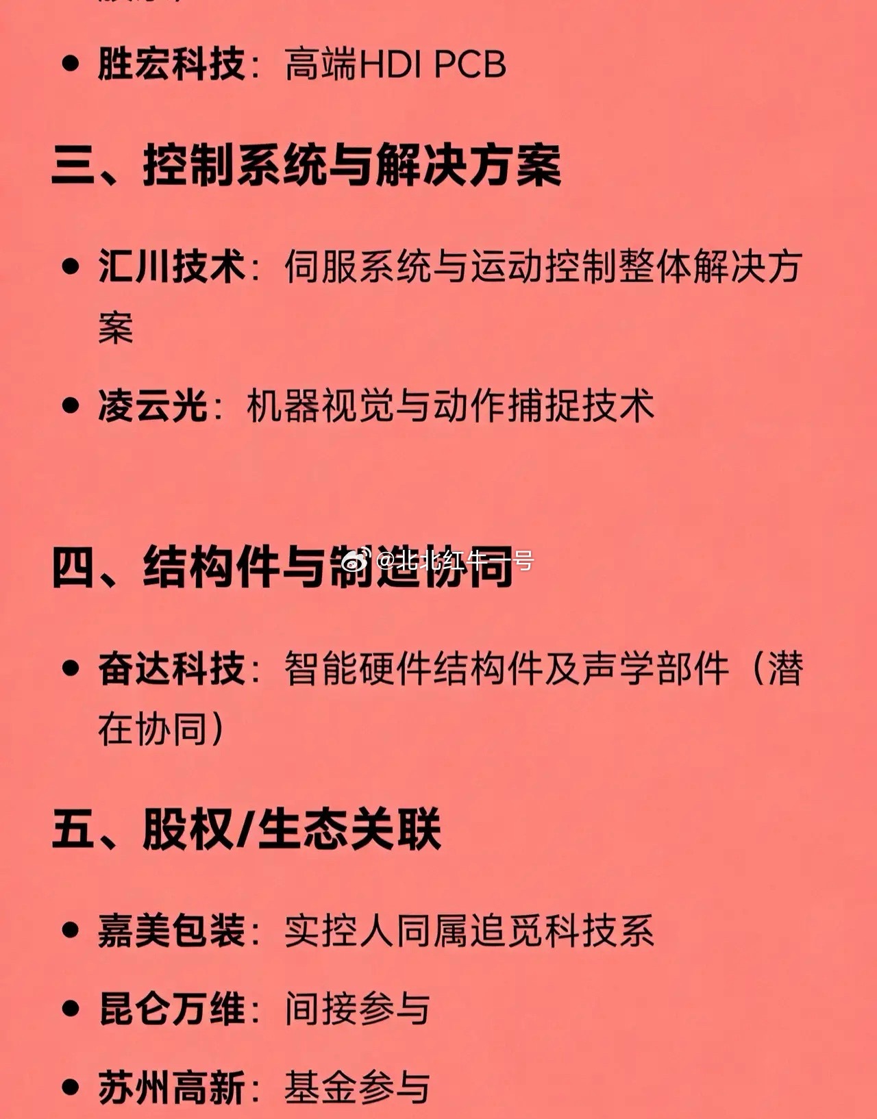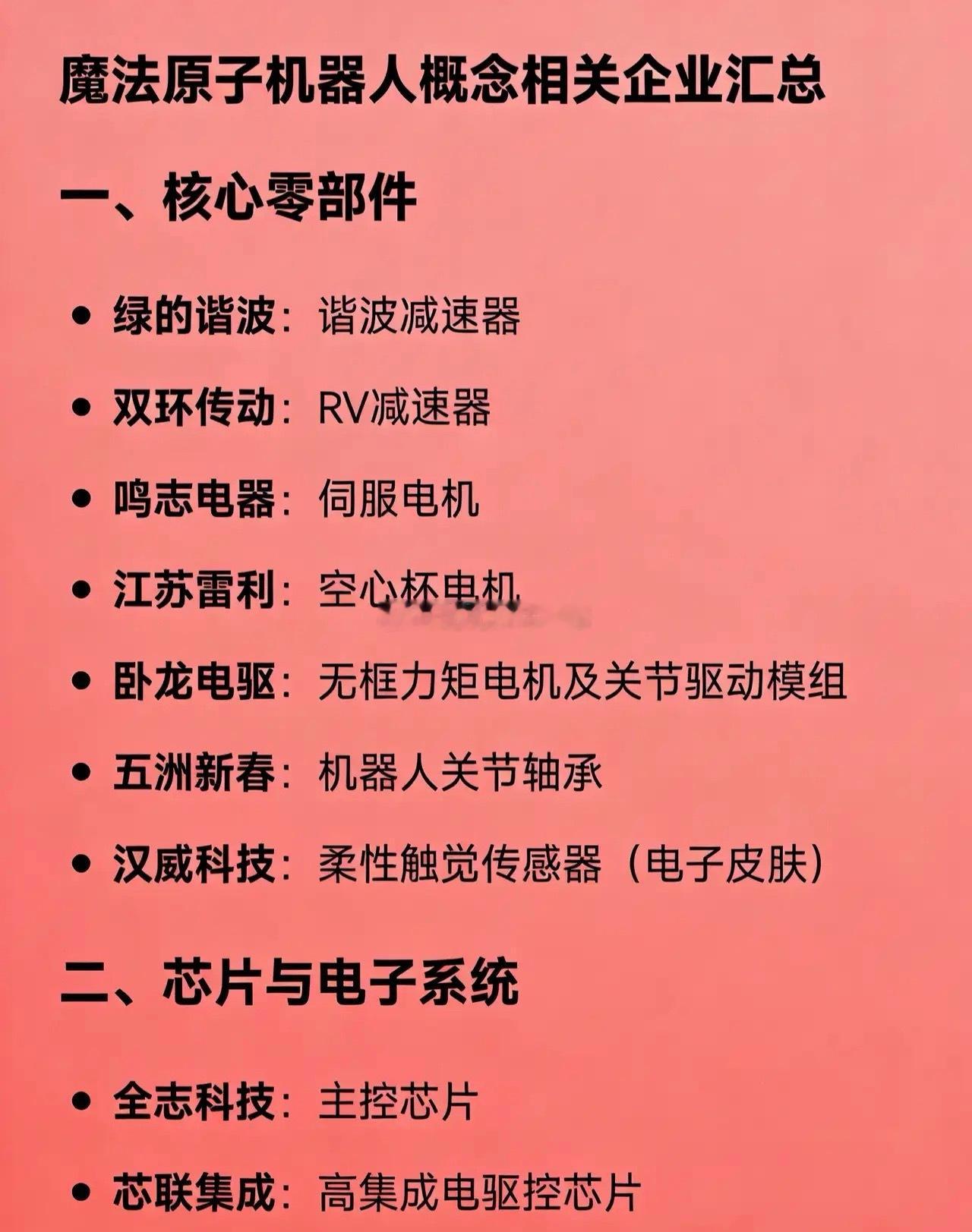 魔法原子机器人概念相关企业汇总一、核心零部件绿的谐波:谐波减速器双环传动:RV减速器鸣志电器:伺服电机江苏雷利:空心杯电机卧龙电驱:无框力矩电机及关节驱动模组五洲新春:机器人关节轴承汉威科技:柔性触觉传感器(电子皮肤)二、芯片与电子系统全志科技:主控芯片芯联集成:高集成电驱控芯片(联合开发 + 股东)胜宏科技:高端HDI PCB三、控制系统与解决方案汇川技术:伺服系统与运动控制整体解决方案凌云光:机器视觉与动作捕捉技术四、结构件与制造协同奋达科技:智能硬件结构件及声学部件(潜在协同)五、股权/生态关联嘉美包装:实控人同属追觅科技系昆仑万维:间接持有苏州高新:基金参与