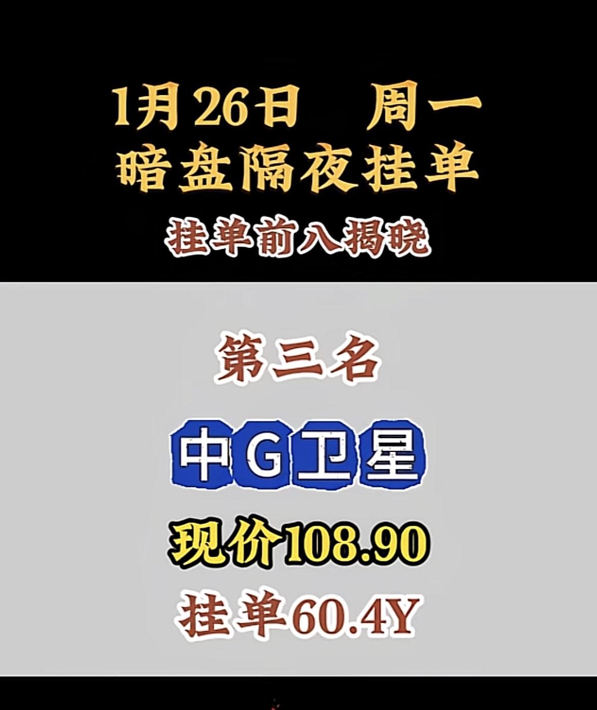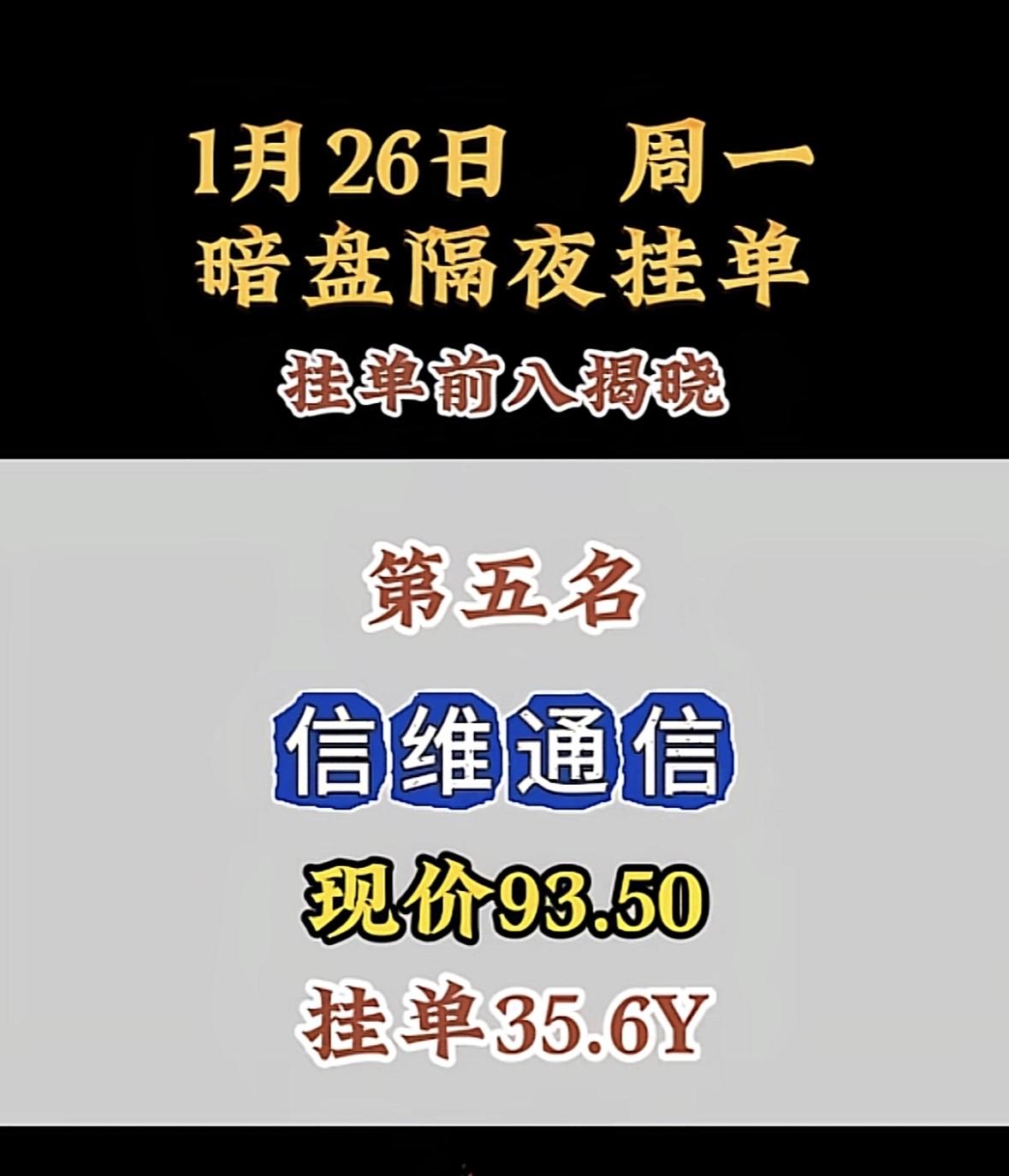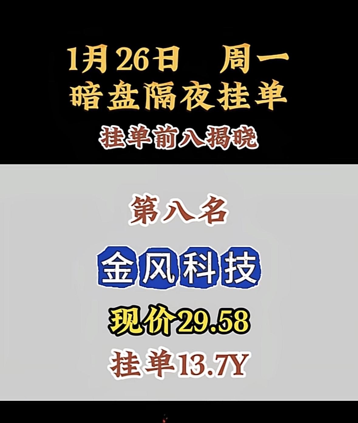 1月26日暗盘隔夜挂单,揭晓第八名金风科技,现价29.58,挂单13.7Y 航天电子暗盘夺冠,现价挂单近百亿,周一首战告捷领跑市场 周一暗盘航天电子挂单居首,现价吸金近百亿,市场热度瞩目。