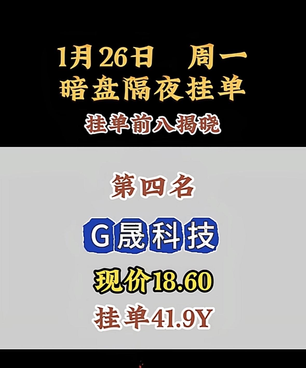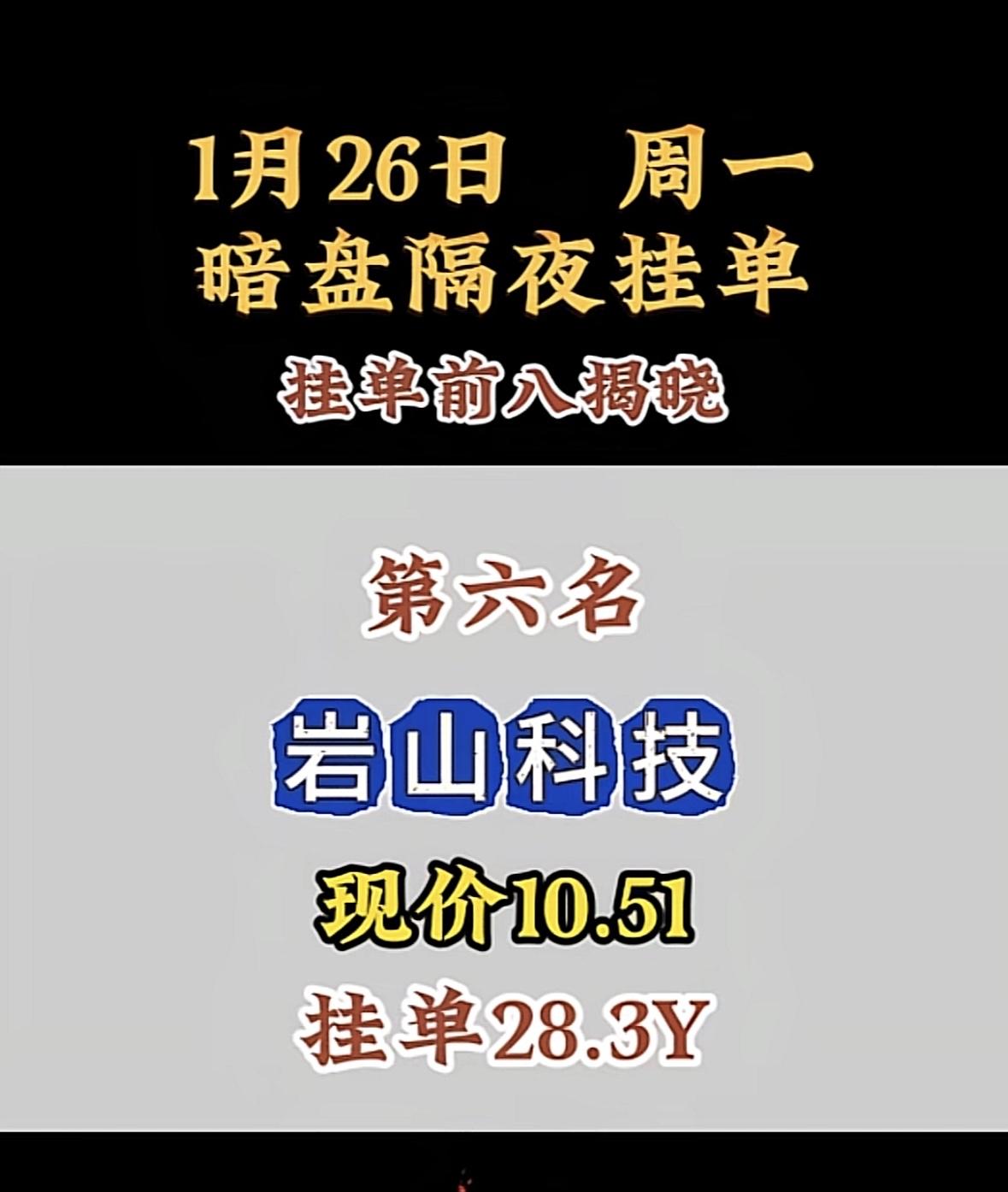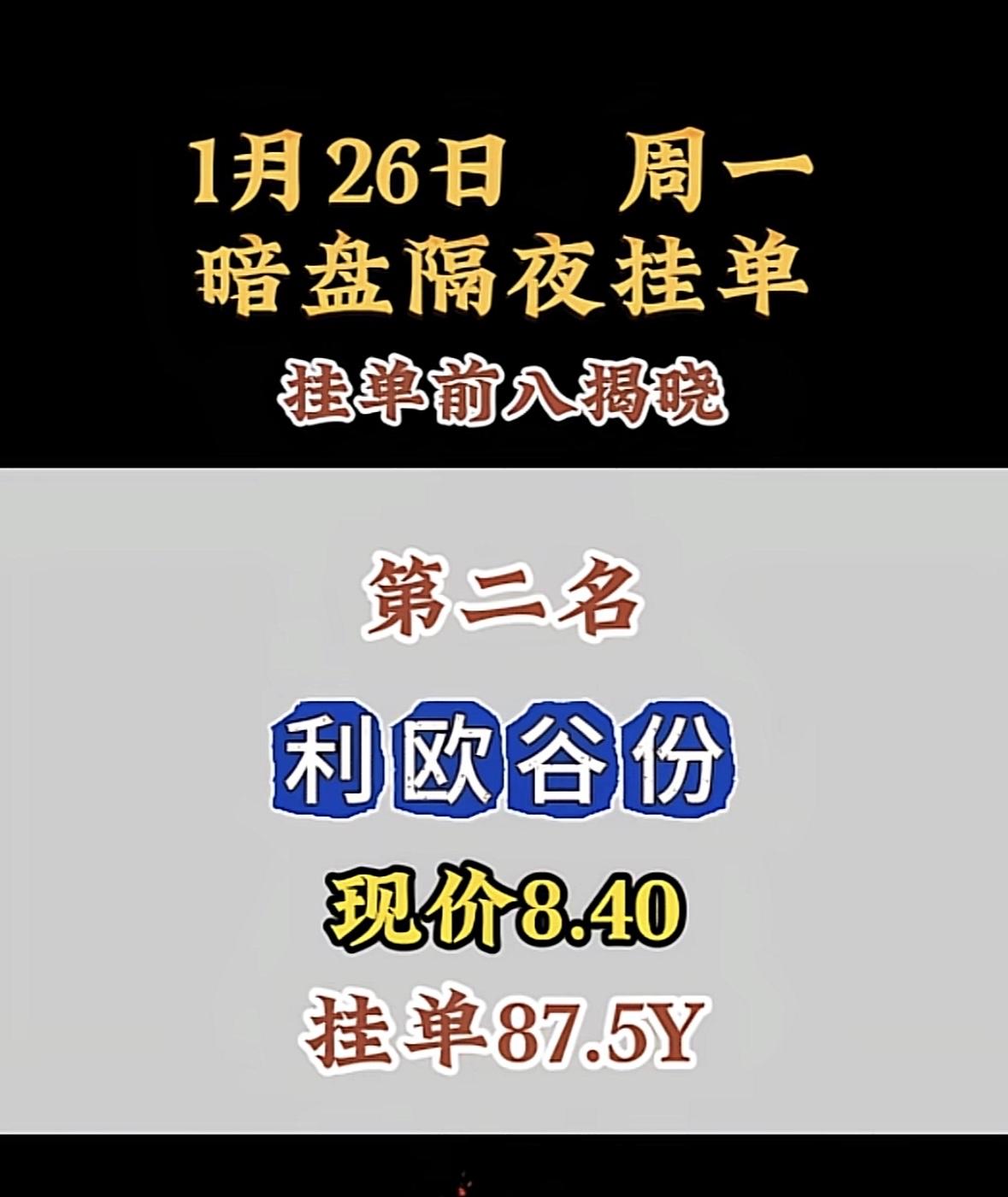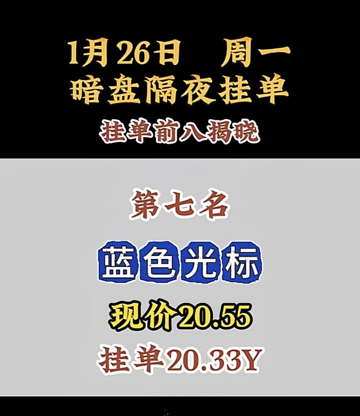 1月26日暗盘隔夜挂单,揭晓第八名金风科技,现价29.58,挂单13.7Y 航天电子暗盘夺冠,现价挂单近百亿,周一首战告捷领跑市场 周一暗盘航天电子挂单居首,现价吸金近百亿,市场热度瞩目。