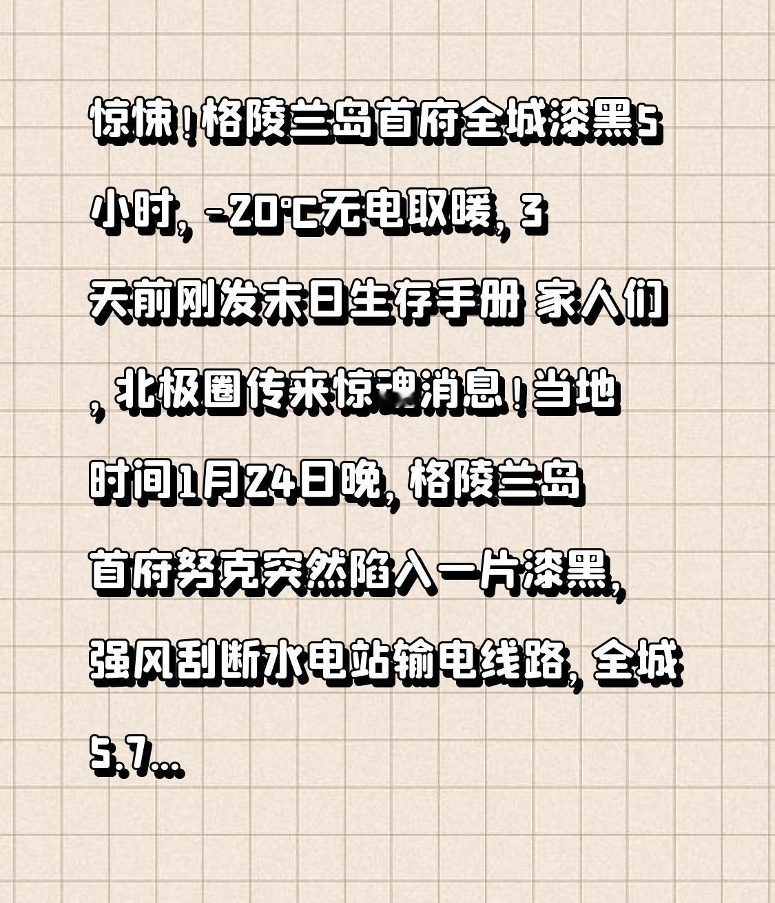 惊悚!格陵兰岛首府全城漆黑5小时,-20℃无电取暖,3天前刚发末日生存手册 家人们,北极圈传来惊魂消息!当地时间1月24日晚,格陵兰岛首府努克突然陷入一片漆黑,强风刮断水电站输电线路,全城5.7万居民在零下20℃的严寒中,度过了5小时的无电黑夜!更诡异的是,就在3天前,格陵兰刚发布“末日生存手册”,要求每人储备5天粮食和饮用水,这场停电到底是意外,还是早有预兆? 可能有人觉得“停电而已,多大点事”?在北极圈的努克,停电可不是小事!这里85%的居民是因纽特人,靠狩猎和渔业为生,冬天全靠电取暖、冻存食物。当晚10点30分,Buksefjord水电站的输电线路被强风摧毁,整个城市瞬间断电:家里的电暖器直接罢工,室温以每分钟1℃的速度下降;超市的冷柜停止运转,刚捕捞的鳕鱼、三文鱼面临变质;连医院的备用电源都只能维持核心设备,普通病房的病人只能裹着三层毛毯御寒。 第一个转折点来了:就在居民们手足无措时,3天前发放的《自给自足五天》应急手册派上了用场!手册里明确要求储备3升/人/天的饮用水、五天应急食品,还有狩猎武器和渔具。不少家庭早就备好压缩饼干、罐头和取暖蜡烛,甚至有人拿出狩猎用的煤油灯照明,靠提前冻好的冰块维持食物新鲜。网友调侃:“这哪是生存手册,简直是预言书”,而这背后,是格陵兰2025年就发生过17次大规模停电的无奈——基础设施极度薄弱,93英里的公路撑起216万平方公里的土地,极端天气一来就容易“瘫痪”。 第二个反转更让人细思极恐:这场停电看似是自然灾难,实则藏着大国博弈的影子!就在手册发布当天,美国总统特朗普在达沃斯论坛公开宣称,要“立即”启动收购格陵兰岛的谈判,还威胁对反对的欧洲国家加征关税。要知道,格陵兰藏着全球近30%的稀土储量,石油远景储量超175亿桶,还扼守北极航道咽喉,战略价值堪比黄金。而中国之前拟投资5.5亿美元的机场扩建项目,被以“国家安全”为由叫停,导致当地基础设施改善彻底停滞,这次水电站故障,本质就是“基建落后”的必然结果。 更揪心的是停电引发的连锁反应:努克机场的导航系统降级,所有区域航班全部取消,滞留旅客只能在候机楼裹着保暖物资过夜;渔业加工场停工,直接影响占格陵兰出口90%的渔业收入;部分偏远社区因为通信中断,一度和外界失去联系,直到应急发电机启动才恢复信号。好在电力部门紧急抢修,到凌晨3点已有75%区域恢复供电,清晨实现全城复电,否则在零下20℃的严寒中,后果不堪设想。 第三个关键转折:事件暴露的不只是基建短板,还有北极地缘争夺的白热化。丹麦迅速联合法德等7国启动军事演习,北约也表态要“确保北极安全”,以此回应美国的“购岛”威胁;而格陵兰自治政府一边强调“停电与地缘博弈无关”,一边悄悄强化基础设施防护,85%的民众明确反对并入美国,用民意划出主权红线。这场看似普通的停电,实则是小国在大国夹缝中求生存的微观缩影。 其实格陵兰的困境,早就给我们敲响了警钟:在极端环境和地缘博弈的双重压力下,基础设施和应急储备才是生存的底气。从3天前的生存手册到这场突发停电,格陵兰人用行动告诉我们:未雨绸缪从来不是杞人忧天,而是对生命最基本的敬畏。 你觉得格陵兰的停电是意外吗?大国争夺北极资源会引发新的冲突吗?评论区聊聊你的看法,点赞转发,让更多人看清这场北极黑夜背后的真相,也为在极端环境中坚守的格陵兰人祈福!