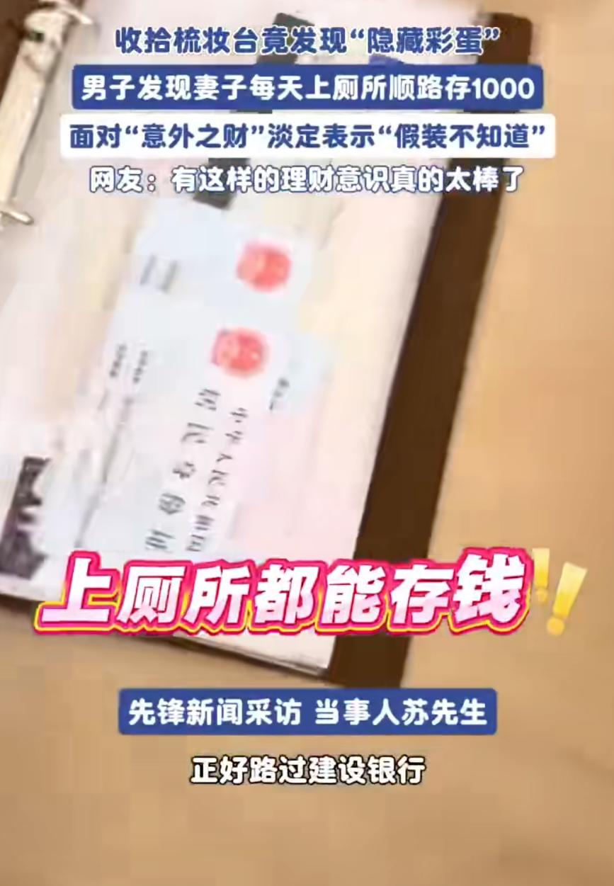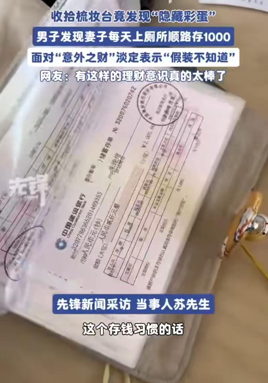 这是惊喜还是惊吓!江苏宿迁,一男子在家里大扫除,突然在妻子的梳妆台抽屉里看到两个记事本,男子好奇打开一看,里面竟然是一张张的存单,金额大概是20万左右,而他却完全不知情,男子表示:她不想让我知道那我就不问 苏先生介绍,两个人都是90后,经营着自己的小生意,收入不稳定,按天结算。他们的店铺旁边恰好有一家银行。从存单日期上看,从去年8月开始,妻子几乎每天借着上厕所的工夫,悄悄去银行存一千块钱。她这么做,是怕钱放在手里不知不觉就花掉了 苏先生看着这些存单,先是惊讶,随后笑了。他并没有质问妻子为什么瞒着自己,反而觉得应该尊重妻子的心意。他说,既然妻子不想让他知道,那他就不问 事情在网上传开后,很多人关注的焦点放在了“每天存一千”这个数字上。有网友感叹,这已经超过了大部分家庭的日收入,能这样存钱的家庭,经济条件应该不错 但在我看来,这件事真正触动人的,并不是存款的数额,而是夫妻之间的那种信任与分寸感 婚姻里,钱往往是个敏感话题。多少夫妻因为钱的问题争吵、猜忌,甚至走到分离。而这位丈夫发现妻子私下存钱后,第一反应不是怀疑和指责,而是理解和尊重。这种反应背后,是一种难得的信任,他相信妻子这么做不是为了防备自己,而是为了这个家更好的未来 妻子选择每天存一千,而不是一次性存入大笔钱,这种细水长流的方式,也反映了很多普通人理财的真实状态 对于收入不稳定的家庭来说,这种“化整为零”的储蓄方式其实很聪明。钱在手上容易花掉,变成存单就有了约束力。每天一千,看似不多,但日积月累,一年下来就是一笔可观的储蓄