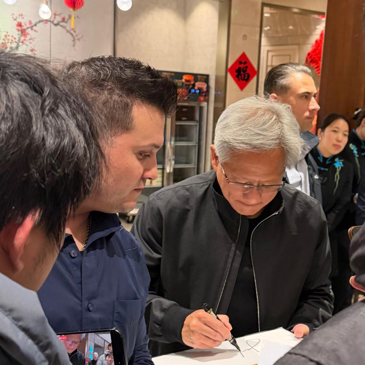 黄仁勋现身北京! 1月25日,英伟达创始人黄仁勋现身北京,到王府中环翠园用餐。 一路上,收到粉丝的热烈欢迎,老黄现场也送粉丝签名。老王很接地气,非常完美的一天。 话说黄老板的两个保镖很敬业啊,一前一后站在雇主前后。