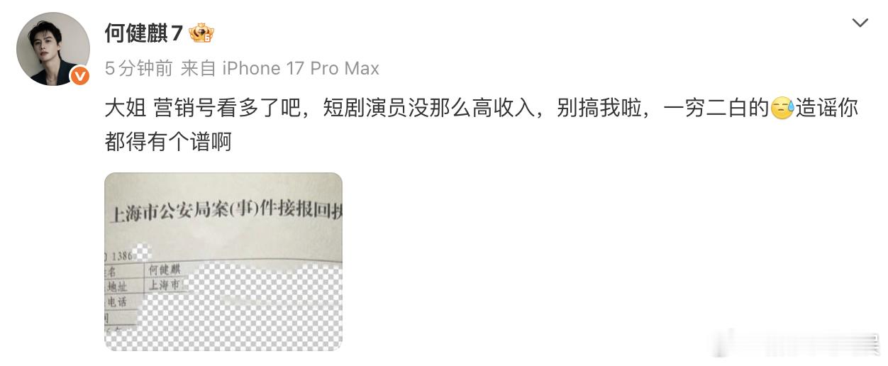 何健麒 大姐营销号看多了吧何健麒 短剧演员没那么高收入 何健麒回应:“大姐 营销