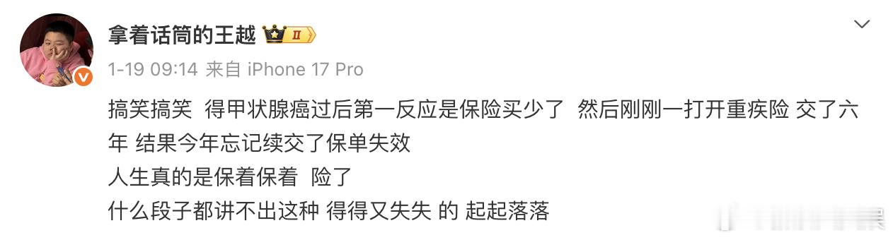 脱口秀演员王越术后报平安 脱口秀演员王越换甲状腺癌,做手术后报平安,要快快康复啊