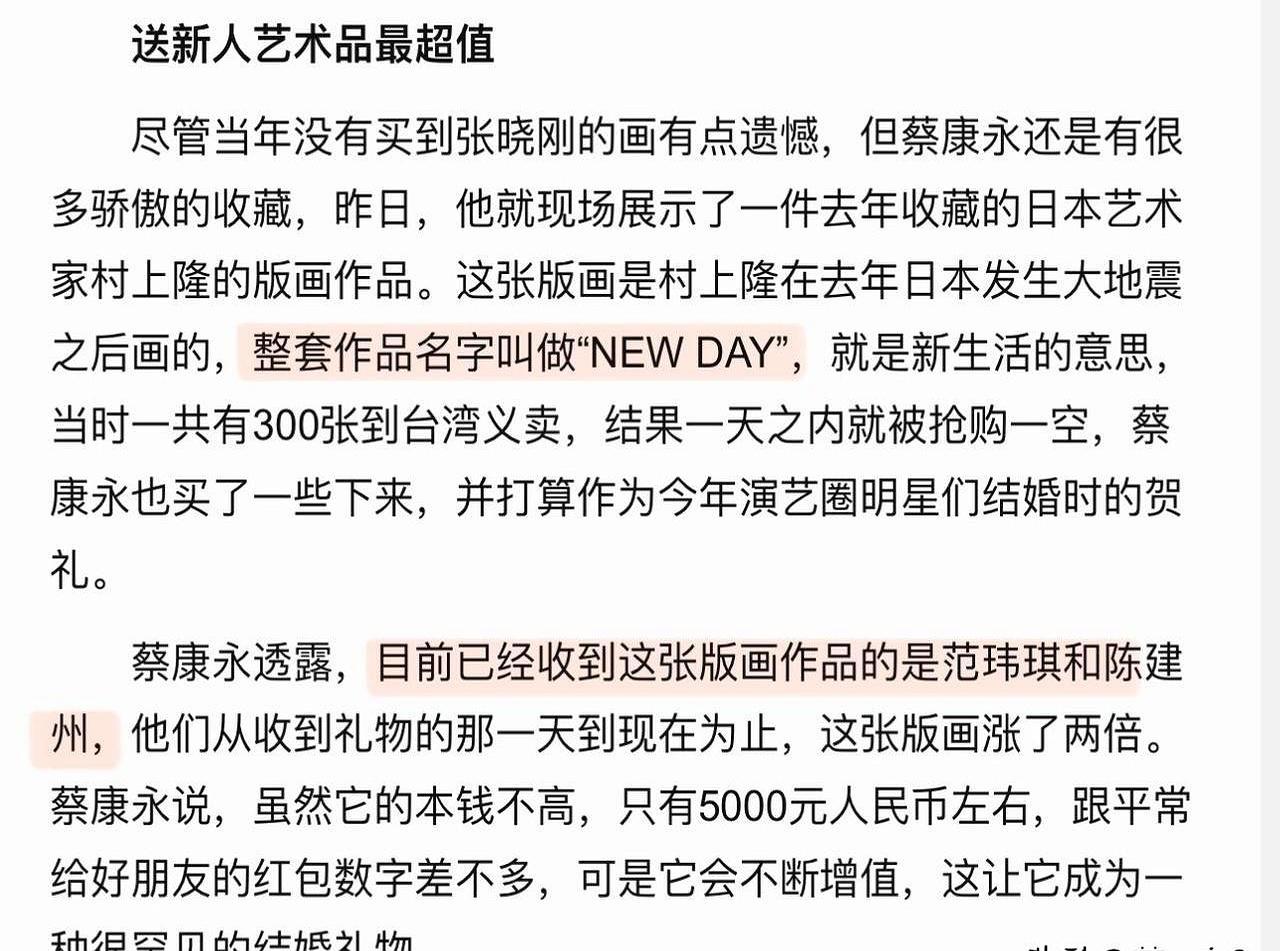 蔡康永送礼,真有他的一套。 陈汉典和Lulu不是要办婚礼了嘛。蔡康永送了幅村上隆的版画。这玩意儿现在值个二十来万台币。 但妙就妙在,这画根本不是现买的。 是他2011年就批量买好,屯在那儿的。当时就放话了,专门等圈里朋友结婚挨个送。这么算,陈建州和范玮琪当年算是第一批“中奖”的。 这人情世故,提前十几年就给你规划得明明白白。真绝了。