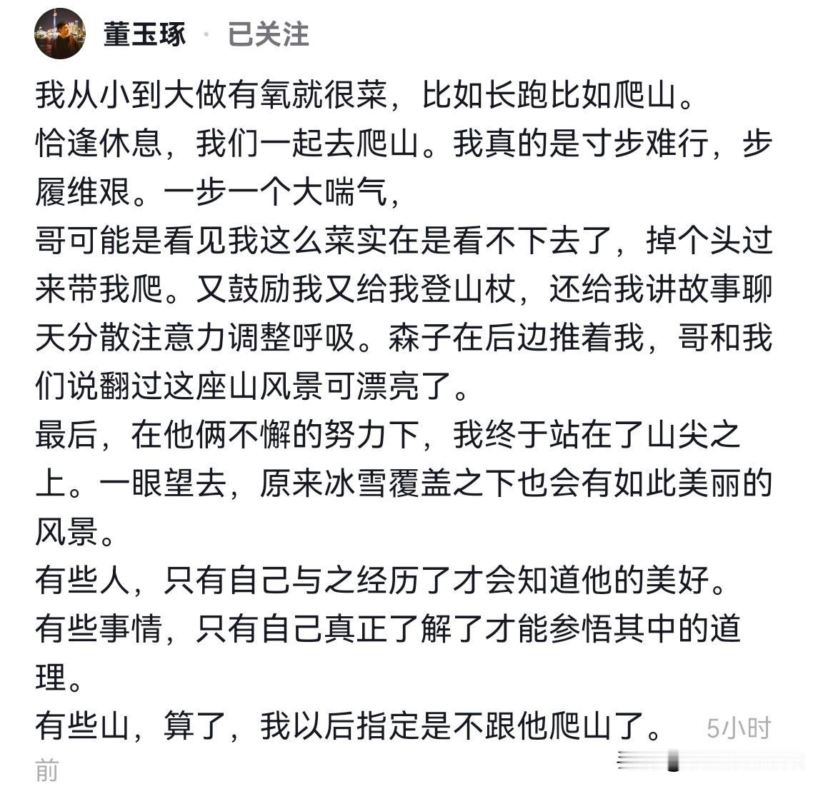 1月25日,与辉同行主播董董更新爬山vlog,同行的还有董宇辉和汉森。 董董是我最喜欢的主播之一,他不仅长相帅气,而且多次向董宇辉伸出援助之手。 董董说他不擅长爬山,董宇辉实在看不下去了,直接把登山杖给了他,汉森就在后面推董董。 董董说:“有些人,只有自己与之经历了才会知道他的美好。有些事情,只有自己真正了解了才能参悟其中的道理。” 想当初,董董主动放弃上个直播间,义无反顾地选择与辉同行,和董宇辉从头开始干。 我会一直支持与辉同行的,祝董董与董宇辉友谊长存。