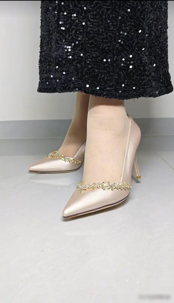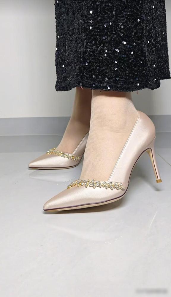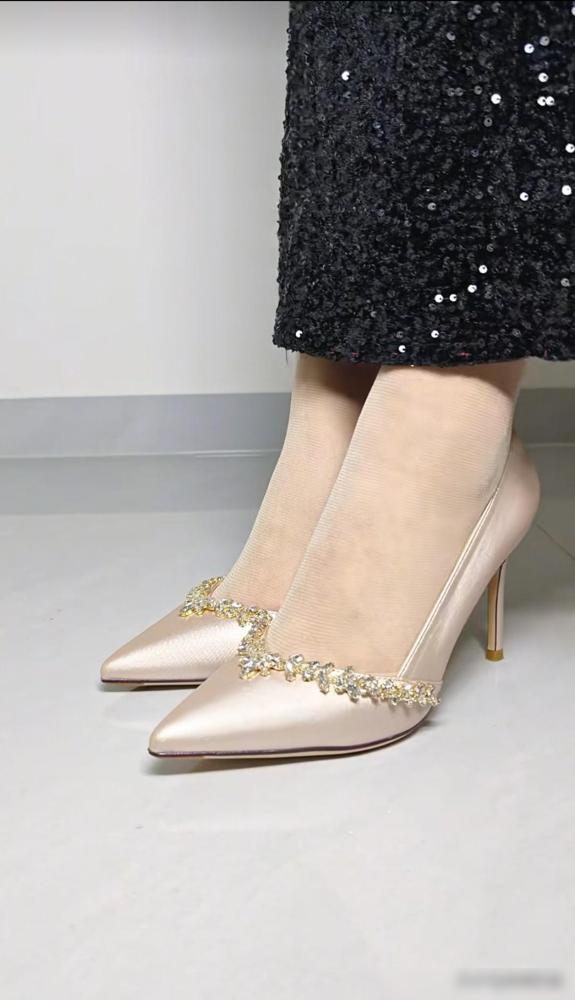 缎面配水钻这种组合,纯粹就是为了物理意义上的“闪瞎眼”而生的。 隔着屏幕都能闻到那股子烧钱的味儿,水钻链条晃得人眼晕。细得像针一样的鞋跟戳在地上,配上那个能当武器使的尖头,视觉上确实能把腿长强行虚增十厘米。 这就是典型的“美丽刑具”。每走一步都在跟地心引力硬刚。 薄如蝉翼的肉丝往上一套,再加上反光亮片裙,你就是这街上最嚣张的信号灯。这种所谓的仙女感,说白了就是用脚尖遭的罪,换路人回头看你的那两眼,主打一个死要面子活受罪。