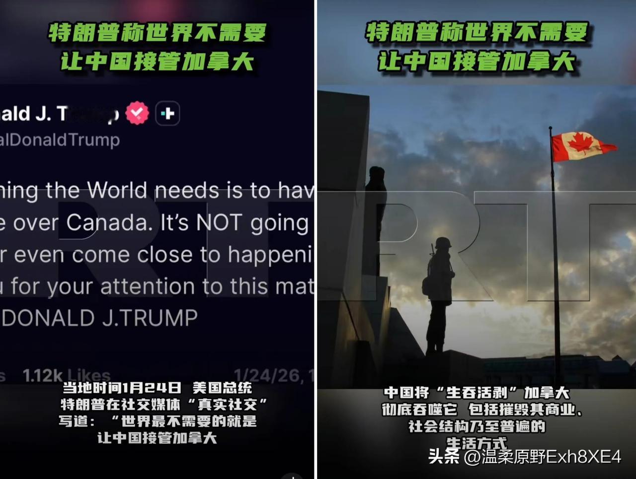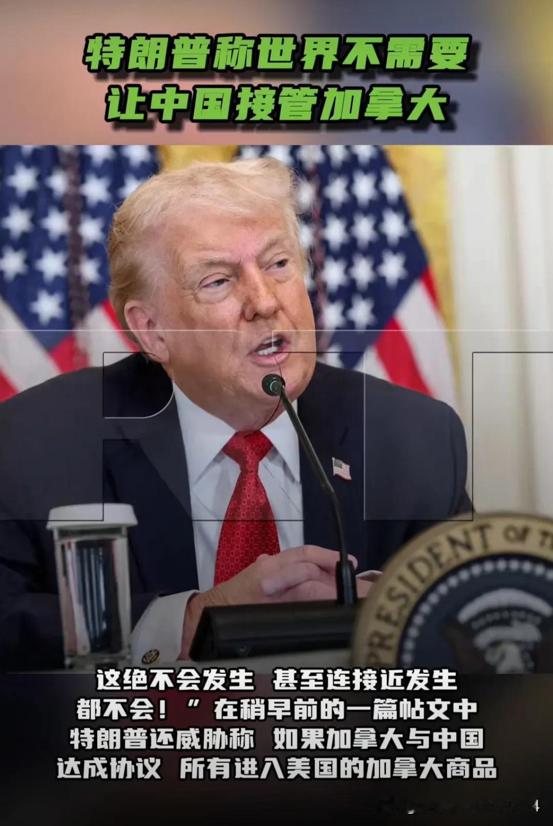 人啊,一旦产生妄想,总会胡说八道! 前些天加拿大总理卡尼,到咱这儿访问,不是跟咱签署了经贸合作意向嘛。 而就在最近的达沃斯世界经济论坛上,卡尼发表演讲时直白表示,由美国主导、基于规则的国际秩序已经终结,世界正经历“断裂而非过渡”,加拿大这样的中等强国必须转向,避免沦为强权“胁迫”的牺牲品。 结果特朗普不知道哪根筋搭错了,24日又在社媒上发文,“咬上”东大: “世界最不需要的就是让中国接管加拿大。如果加拿大与中国达成协议,所有进入美国的加拿大商品将立即被征收100%的关税。” 网友:他天天想侵占,所以看别人合作就是侵占,简直胡说八道!