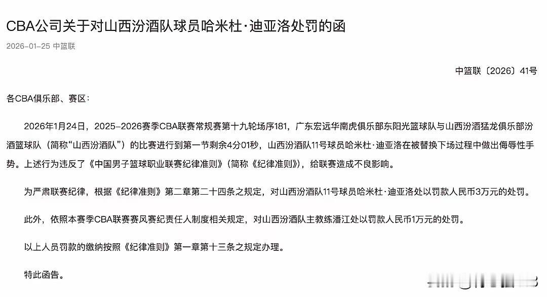 记录我的2026迪亚洛被追加处罚了,客场挑战广东队第一节迪亚洛3次犯规下场休息做出数钱动作,清晰被镜头捕捉到了,CBA公司肯定会赛后追加处罚的。对照去年莫兰德在广东做出数钱动作被罚的标准,迪亚洛被罚款3万元,潘江罚款1万属于正常的,还有迪亚洛如果在赛场上在不注意自己的动作,技术犯规累积到了一定次数也是要被罚款和禁赛的,现在迪亚洛的技术犯规次数可是遥遥领先