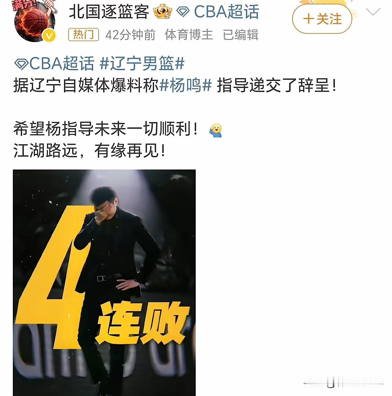 杨鸣下课,昨晚辽宁男篮客场输给新疆就传出来杨鸣下课的消息。我个人觉得杨鸣下课应该差不多吧,今年辽宁就这外援水平谁来了也不能带队取得好成绩,也就是培养年轻球员吧。 客场挑战新疆队杨鸣一反常态给了年轻球员大量出场时间,到了第四节单外援时间辽宁男篮就顶不住了,威尔斯和莫兰德年纪大了打不动了,上去也是各种失误。不过几个年轻球员发挥的不错,既然是培养年轻球员用乌戈还是不错的。当初乌戈带队几个年轻球员就打得不错,为了夺冠只能请回杨鸣带队。现在也没有夺冠压力了,也不想花大价钱投资就踏实培养年轻球员吧