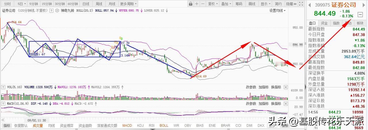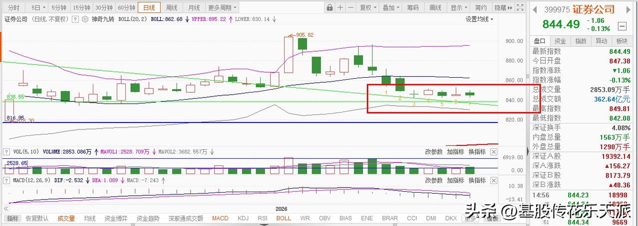 A股证券市场即将开盘,券商板块在“长期逻辑利好”与“短期情绪谨慎”并存的状态下,不出意外的走势,今天大概率要这么走了! 趁开盘之前,强调三点: 第一点:如果市场将“强监管”解读为利好资本市场长期健康的发展,且资金继续关注低估值板块,那么,券商板块可能获得支撑甚至出现反弹!反之,若市场情绪因担心活跃度下降而转向悲观,板块可能延续震荡甚至下跌破位。这一点,盘中且先留意观察成交量的变化。 第二点:券商板块自身具备多种积极的因素,如估值低位,提供了较高的安全边际和修复空间;如政策托底,资本市场中长期改革方向明确,严监管旨在健康发展并非“打压”结构牛!如业绩预增且呈现“业绩与股价背离”,一定程度上具备了可投资甚至长期可投资的性价比。另外,还有政策推动中长期资金入市以及居民财富向资本市场转移的长期趋势,……等等都是利好。 第三点:“十五五规划”建议提及“加快建设金融强国”,资本市场深化改革持续向纵深推进且有望优化券商经营环境!近期监管层也传递出了“稳中求进、强监管、促质量”的总基调,对券商板块而言,都是长期趋势的利好。 以证券公司指数的走势为例,如下图二、下图三,一个是日线走势图,连续盘整了五个交易日且即将面临下方的支撑位置,最终的结果肯定会面临抉择;另一个是120分钟走势图,短暂的回调(蓄势)之后,必然面临着向上的突破。 从投资角度看,券商板块兼具“攻与守”,随时可能迎来难得的补涨机遇