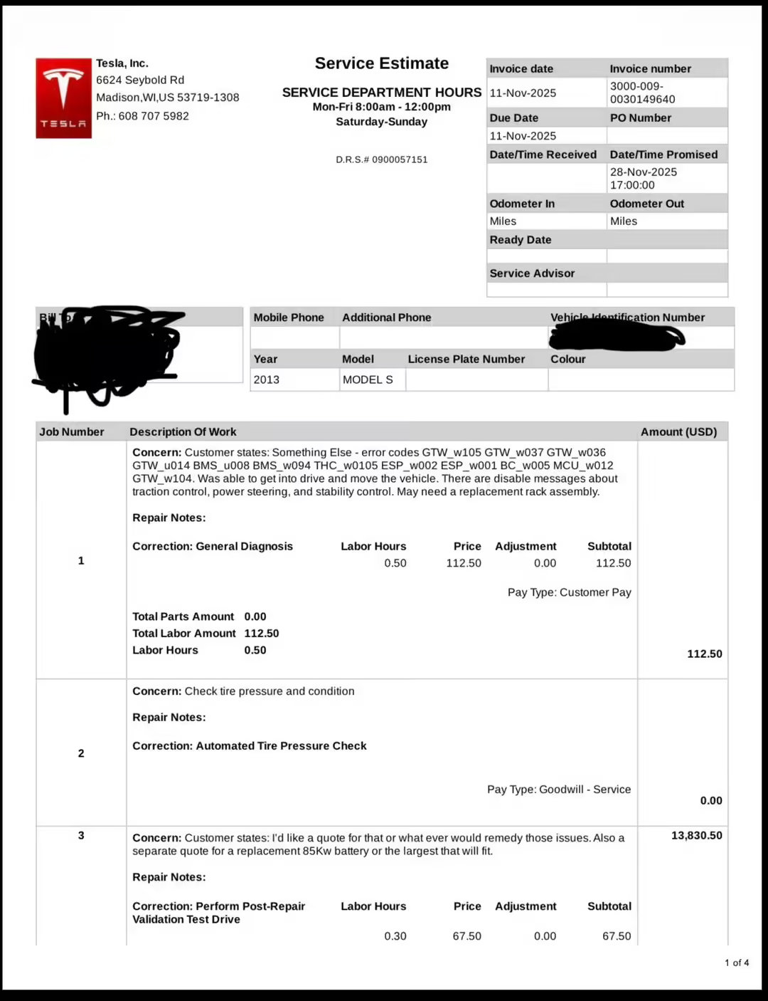 【特斯拉车主称换电池费用超二手车价】众所周知,电动汽车的三电系统更换价格较高,据外媒 carscoops 报道,近期一位美国特斯拉 Model S 2013 款车主便遭遇了电池“刺客”。据悉,这名车主在 Reddit 平台发帖,披露了自己前往美国威斯康星州麦迪逊特斯拉服务中心的经历,其 Model S 车型电池遇到故障,特斯拉提供了“更换同款 60 kWh 电池,或升级为容量更大的 90 kWh 电池”两种方案。具体来看,更换一块 60 kWh 电池的总价为 13830 美元(IT之家注:现汇率约合 96529 元人民币)。这其中,人工费为 580.50 美元(现汇率约合 4052 元人民币),其余 13250 美元(现汇率约合 92481 元人民币)为电池本体的费用。对于如今已经是特斯拉最小规格的电池来说,这个价格显然并不“友好”。如果选择升级到 90 kWh 电池,成本更是直线飙升。电池本体售价 18000 美元(现汇率约合 12.6 万元人民币),车主还需要额外支付 4500 美元(现汇率约合 31409 元人民币)才能解锁全部容量,再加上安装费用及必要的更换零件,总价高达 23262 美元(现汇率约合 16.2 万元人民币)。外媒表示,相应更换电池价格已经远远超过同年份二手 Model S 的市场价值。目前,2013 款 Model S 在美国二手市场的成交价大多在 1 万至 1.5 万美元(现汇率约合 69797 元至 10.5 万元人民币)之间,从经济角度来看,无论是换电池还是升级电池,都完全算不上一笔划算的买卖,某种程度上不如直接购买一辆新车。这位车主在 Reddit 平台的贴文也引发了其他特斯拉车主的热议。虽然不少人表示自己的原厂电池跑了几十万公里依然正常,但一旦汽车的电池确实出现故障,且车辆过保,往往就只能面对高昂的更换成本。(IT之家)