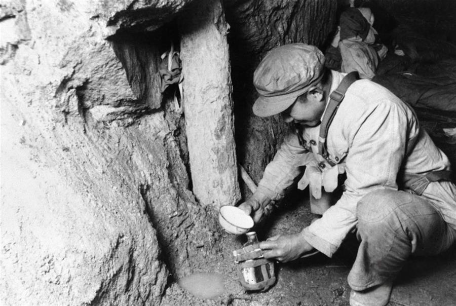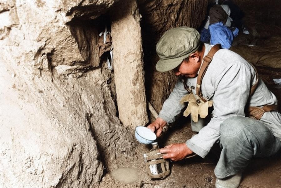 1952年,上甘岭战役期间,美军对志愿军阵地实施了密集轰炸与封锁,坑道内的志愿军面临着严重的断水、断粮困境。 照片中的战士正小心翼翼地用罐头盒接取岩壁渗出的水滴,再倒入碗中积蓄起来。在极度缺水的环境下,这种岩壁渗水是他们维持生命的珍贵水源,有时甚至要数人共用一碗水。