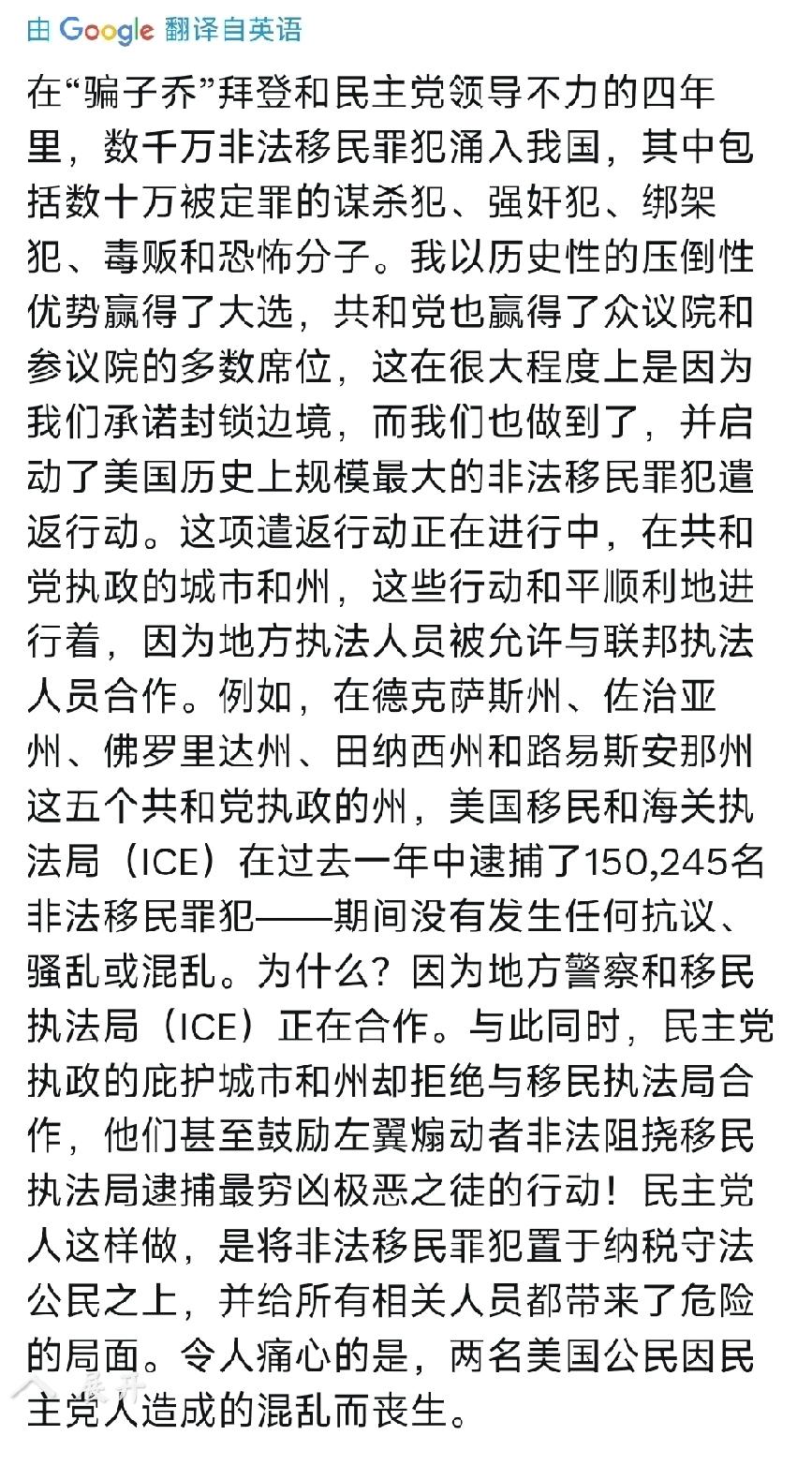依然是甩锅 北京时间1月26日,特朗普发文,回应明尼苏达两位美国民众被执法人员枪击的恶性事件。内容筒述如下 “在骗子乔-拜登和民主党领导不利的四年里,数千万非法移民罪犯拥入我国,我以历史性的压倒优势赢得了大选,共和党也赢得了众议院和参议院的多数席位,这在很大程度上是因为我们承诺封锁边境,而我们也做到了,并启动了美国历史上规模最大的非法移民罪犯遣返行动。这项遣返行动正在进行中。在共和党执政的城市和州,这些行动和平顺利的进行着。因为地方执法人员被允许与联邦执法人员合作。民主党执政的庇护城市和州却拒绝与移民执法局合作,他们甚至鼓励左翼煽动者非法阻挠移民执法局逮捕行动。民主党人这样做是将非法移民罪犯置于纳税守法公民之上,并给所有相关人员都带来了危险的局面。令人痛心的是两名美国公民因民主党人造成的混乱而丧生。” 个人认为:颠倒是非,扭曲事实,编造谎言,煽动人心。特朗普对美国内部也在别有用心的进行着煽动,他不想美国民众安稳,只想绑架民意,误导民意,向有利于自己-一己私利的方向发展。 这个人从头顶到脚下,无时无刻不在为了自己的私利着想,根本没有美国和美国人民。