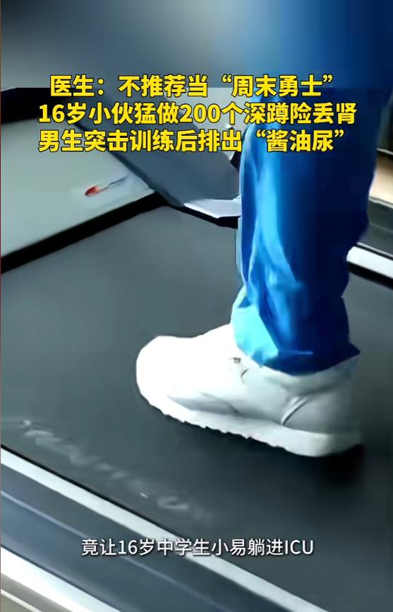 “悲剧还是发生了!”近日,湖南,一男生为了强身健体,在没有热身的基础下,竟直接猛做200个深蹲,结果严重超出身体负荷,做完后双腿就没办法站立,甚至尿液成了酱油色,送医后,才知道是突发横纹肌溶解症,导致急性肾损伤,差点危及生命!   16岁正处于爱逞强的年纪,平日里被学业裹挟,一周下来几乎没有任何运动时间。   趁着周末空闲,男孩突然萌生了练出好身材的想法,听说深蹲能高效锻炼腿部肌肉,便决心靠单次高强度训练快速看到效果。   这种急于求成的心态,让他从一开始就偏离了健康运动的轨道,也为后续的意外埋下了隐患。   运动当天,少年没有做任何热身拉伸,直接扎进深蹲训练中。   过程中,疲惫感不断袭来,但好胜心驱使他咬牙坚持,硬生生完成了200多个深蹲。   起身的瞬间,他双腿一软直接瘫倒在地,起初只当是过度劳累,以为休息片刻就能缓解,并未放在心上。   直到后续上厕所时,看到自己排出酱油色尿液,少年才被强烈的恐惧笼罩,家人得知后立刻送他前往医院就诊。   经医生诊断,少年患上了横纹肌溶解症,且已引发急性肾衰竭,情况十分危急。   医生表示,这正是典型的“周末勇士”综合征,平时缺乏运动的人突然进行高强度锻炼,肌肉细胞会被强行撑破,其中的肌红蛋白会流入血液,就像沙子堵塞水管一样,直接损伤肾脏功能。   这种损伤一旦加重,不仅会影响脏器健康,更可能危及生命,少年此次能脱离危险,完全得益于送医及时。   盲目锻炼的代价,远比想象中沉重。   少年本是出于强身健体的初衷,却因方法不当险些酿成悲剧,这样的结果令人惋惜。   健身从来不是靠一时冲动和蛮劲就能见效的事,忽视身体承受能力的高强度训练,非但不能达到健身效果,反而会对身体造成不可逆的伤害,这种得不偿失的行为,实在不值得提倡。   在现实生活中,像这名少年一样的人不在少数,很多人健身都抱着“一口吃成胖子”的心态,一味追求运动数量和强度,却省略了热身等基础步骤,忽视了身体发出的预警信号。   他们误以为越累效果越好,越坚持越有收获,却不知身体的肌肉和器官,根本经不起这种突然的超负荷折腾。   少年经此一役,对盲目锻炼的危害有了深刻认知,也后悔自己当初的逞强行为。   事实上,健身的核心从来不是比拼强度和数量,而是循序渐进地让身体适应运动节奏。   无论是健身新手还是有经验的爱好者,都必须根据自身情况把控运动强度,运动前做好充分热身,运动中密切关注身体状态,一旦出现不适就及时停止,这才是对自己身体最基本的负责。   这场意外也让我们明白,毫无章法的猛练,其伤害程度远超不运动。   健身的本质是为了强健体魄,而非用身体去冒险。   每一个热爱生活、追求健康的人,都应摒弃盲目健身的观念,用科学的方法践行运动理念。   唯有尊重身体规律,循序渐进地开展训练,才能让健身真正成为守护健康的助力,而非伤害身体的利刃。   愿我们都能从这场意外中吸取教训,理性对待健身,让运动成为陪伴一生的好习惯,而非一时冲动的冒险。   今天的分享到这里就结束了,大家对此事有何看法,欢迎在评论区留言和讨论,感兴趣的可以点击头像加关注,我将每日更新优质内容,我们下期见。