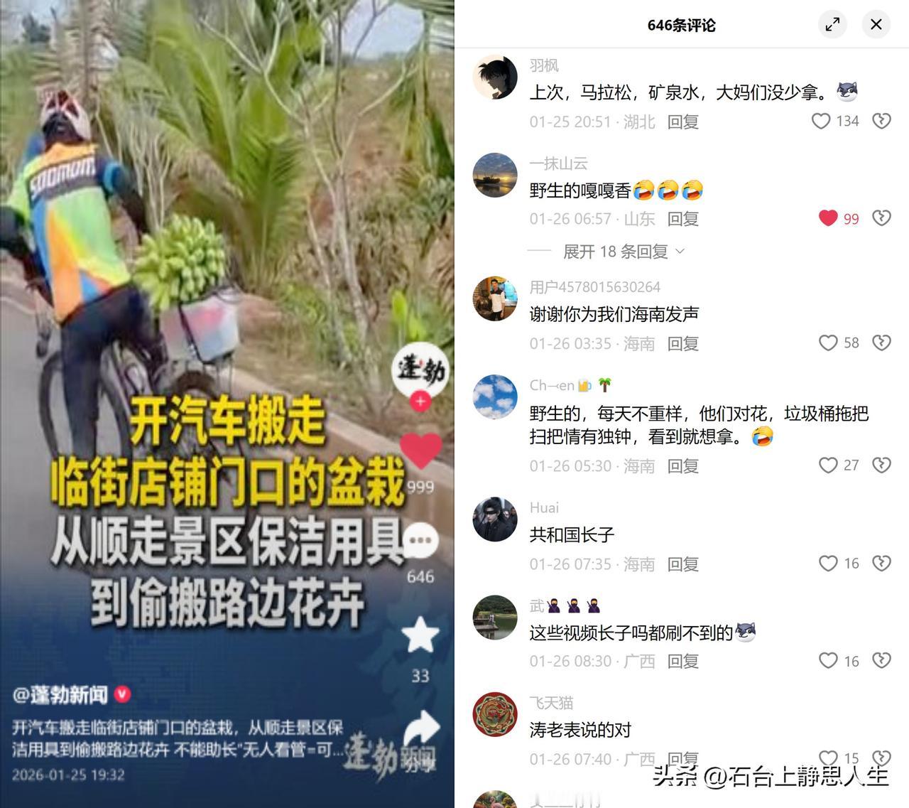开着车搬店铺盆栽?这哪是顺手牵羊,是明抢! 海南保亭有人搬走临街店铺的盆栽,还顺走景区保洁用具,嘴硬只是拿不是偷。 别扯什么野生无主,店门口的盆栽、路边的工具,只要有明确权属,哪怕没上锁、放室外,也是受法律保护的私有财产。 法律早有定论:二年内三次以上盗窃,哪怕单次金额不大,也构成盗窃罪。那些拿无人看管等于可以私占当幌子的,本质是规则意识缺失,把小恶当成了理所当然。 别以为小恶无伤大雅,今天拿盆花,明天可能搬更贵的东西;这次没人管,下次就敢更嚣张。真等到付出代价时再喊只是拿拿而已,早晚了!