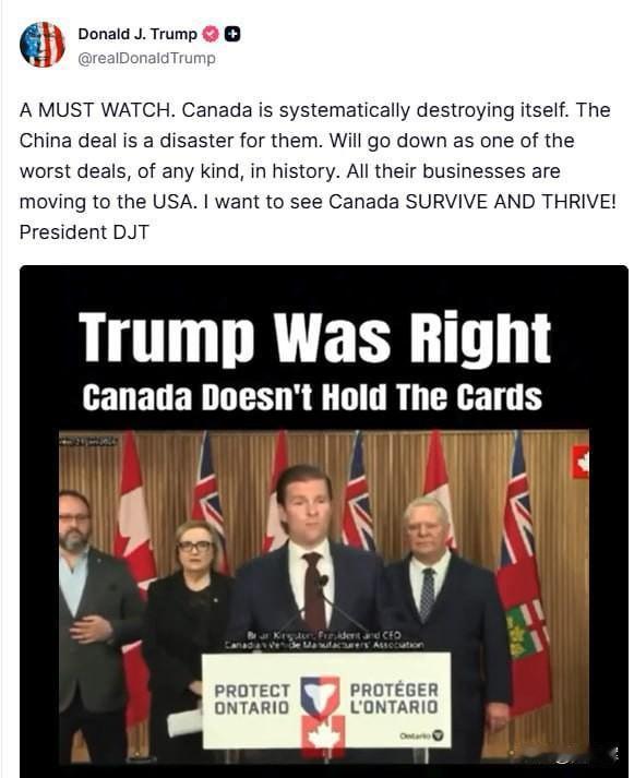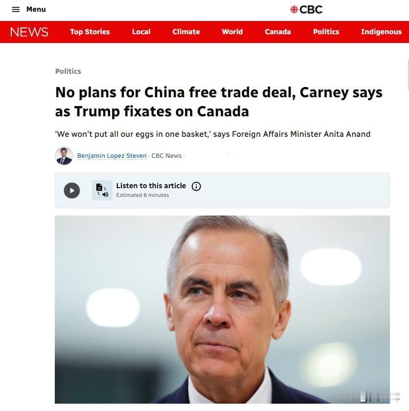 【加总理卡尼反驳特朗普:加拿大暂无与中国签署自由贸易协定的计划】 加拿大总理卡尼称,“我们与中方目前在做的,是解决过去数年里出现的一系列问题”,所涉领域包括中国产电动汽车、农产品及水产品贸易。 他强调,加拿大会履行《美墨加协定》项下义务——协定要求三国中任何一方,若计划与非市场经济体(尤指中国)签署自贸协定,均须提前告知其他缔约方。 加外长安妮塔·阿南德就特朗普近期相关威胁,称并不担忧加美当前关系状况。她下周将赴美,与多国磋商关键矿产相关议题。 阿南德表示,“我们必须守护并壮大加拿大经济,贸易多元化是核心抓手。这正是我们出访中国、即将出访印度的原因,也正是我们不会把所有鸡蛋放在同一个篮子里的原因。” 此前,特朗普发文施压加拿大称,“加拿大这是在自掘坟墓,和中国的协议对它而言就是灭顶之灾,必将载入史册,成为史上最糟糕的协议之一。他们的企业全在往美国迁,我倒要看看,加拿大要怎么活下去、怎么繁荣起来!”帖文还附带了加拿大汽车制造商协会总裁兼首席执行官布莱恩·金斯顿的发言视频,后者警告,与中方达成的相关协议或将导致加拿大汽车产业覆灭。