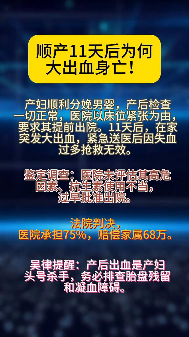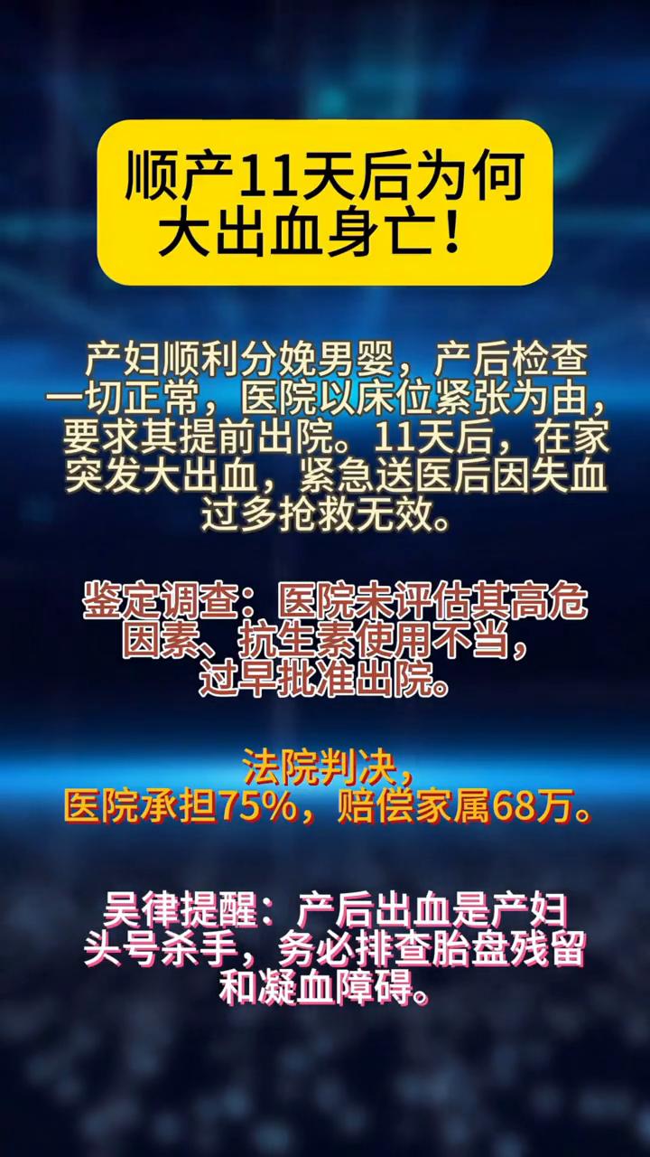 顺产11天后为何大出血身亡? 产妇顺利分娩男婴,产后检查一切正常,医院以床位紧张为由要求其提前出院。11天后在家突发大出血,紧急送医后因失血过多抢救无效。鉴定调查:医院未评估其高危因素、抗生素使用不当,过早批准出院。法院判决,医院承担75%,赔偿家属68万。 吴律提醒:产后出血是产妇头号杀手,务必排查胎盘残留和凝血障碍。