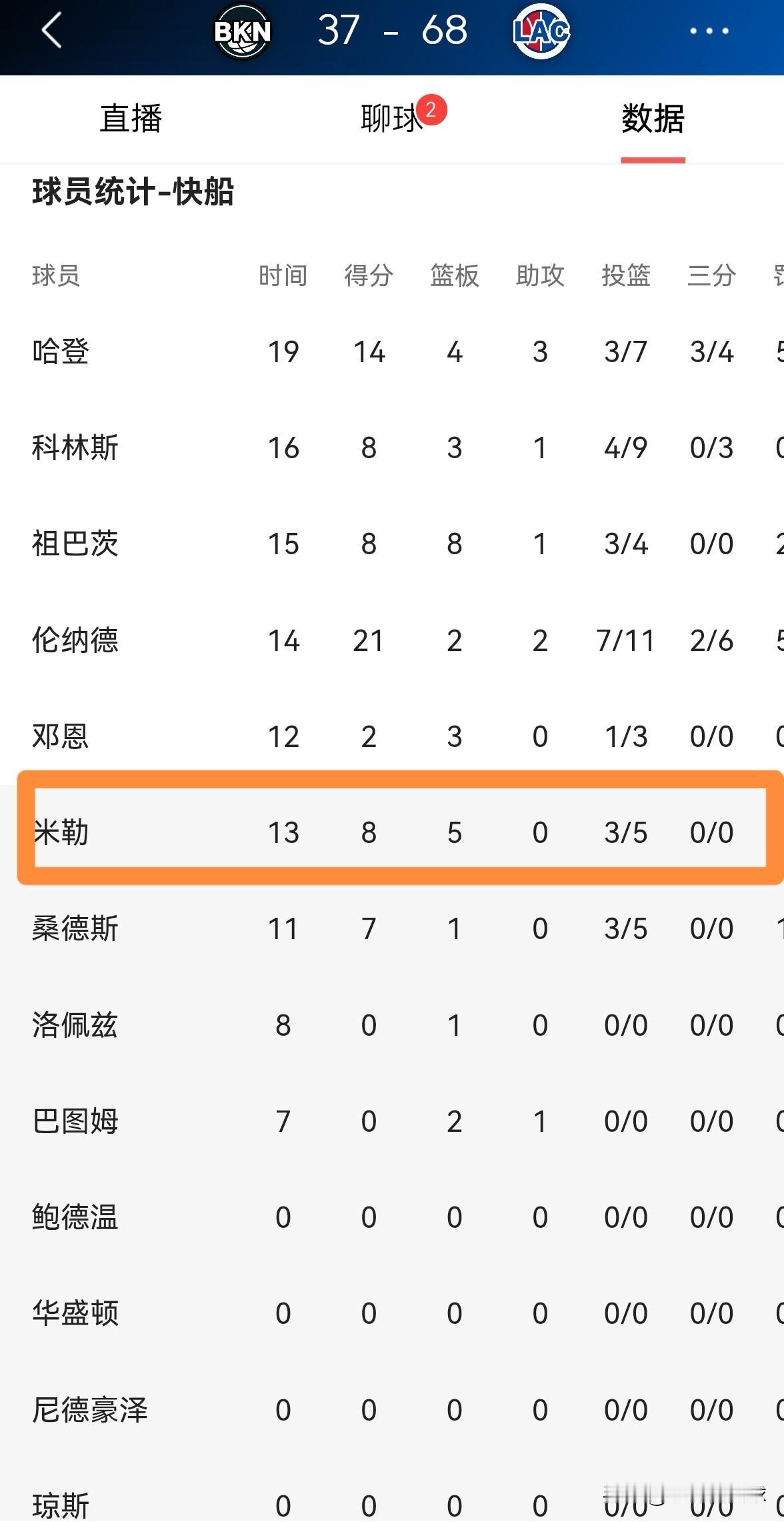 我强烈建议快船立刻给小将米勒转正!在今天快船主场迎战篮网的比赛中,目前双方半场战罢,快船暂时以68:37领先对手。值得一提的是,在前两节比赛中,米勒又在攻防两端打出了非常亮眼的表现,他在替补出战的13分钟里,投篮5中3,其中罚球2中2非常高效的得到8分,还有5篮板1助攻,他的场上正负值为+20。 作为一名双向合同球员,米勒能够打出如此精彩的表现真是太让人喜出望外了,毫不夸张的说,如果快船再不给米勒转正,米勒有可能被其他球队挖走。