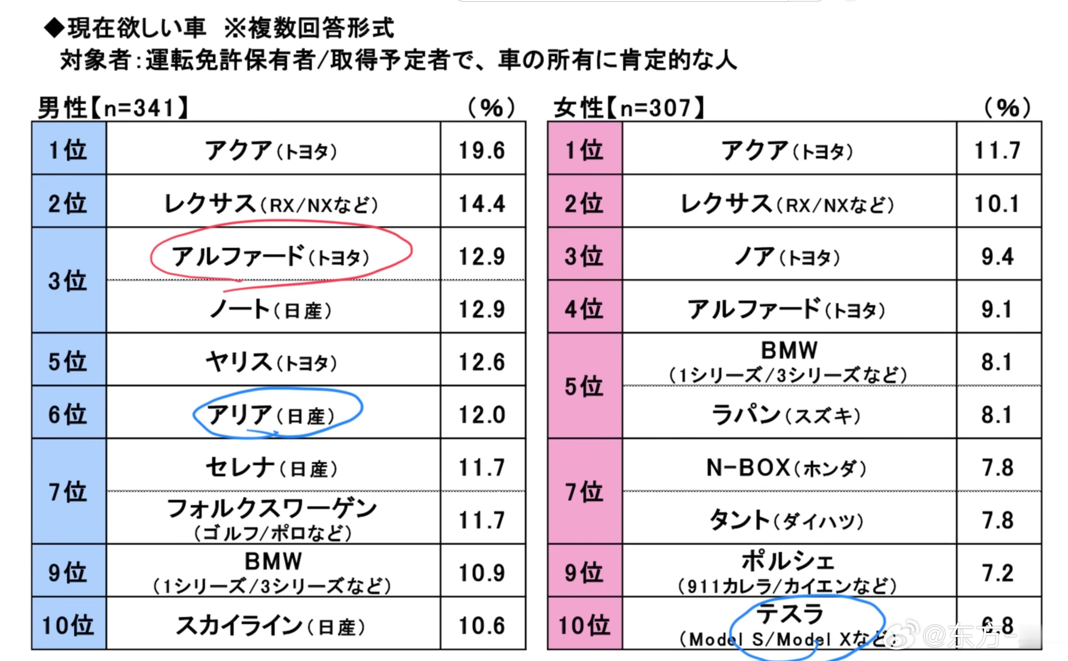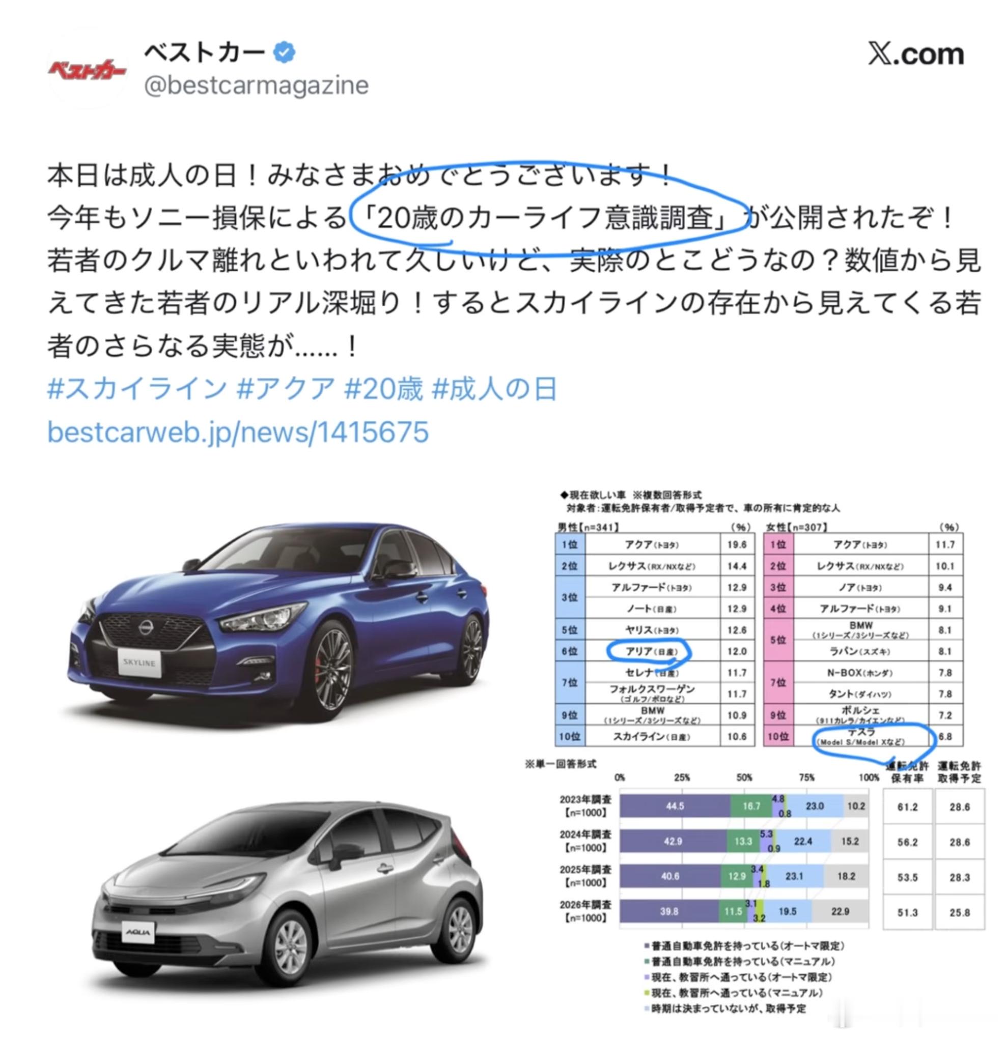 索尼调研05后日本人用车需求:希望车企能推出更多面向年轻人的车索尼损害保险于2026年1月6日,发布了《2026年20岁青年汽车生活意识调查》的结果。该调查以2005年4月2日至2006年4月1日期间出生的1000名青年男女为对象,进行互联网调研。值得注意的是,20岁青年的驾照持有率仅为51.3%,已连续三年呈下降趋势。其中,手动挡驾照的持有率更是低至11.5%。从这个结果来看,与过去“满18岁或高中毕业就立刻考驾照”的时代相比,如今的驾照持有率确实算不上高。但如果把“计划考取驾照”的人群算进来,这一比例就能达到25.8%。假设这部分人群最终全部成功考取,20岁青年的驾照持有率还会大幅提升。更何况,本次调查统计的是“当前”的持有率,若考虑到未来几年或近期的考取计划,这一数值大概率还会继续增长。此外,在包含无驾照人群的统计中,有14.6%的受访者表示“有购车计划(不含摩托车)”,39.4%的受访者表示“暂无购车计划,但未来希望拥有”。两项合计,对拥有汽车持积极态度的年轻人比例高达67.2%。不仅如此,有41.1%的受访者表示“喜欢开车兜风”,30.0%的受访者表示“对汽车感兴趣”。这足以说明,即便在年轻人与汽车渐行渐远的当下,依旧有相当一部分人渴望享受驾驶与自驾出行的乐趣。在物价上涨与收入水平不匹配的当下,年轻人更青睐实用性强的车型。配图为2025年9月完成部分改良的丰田Aqua(车长4080毫米的混动掀背,价格约为250万到300万日元)。本次调查当然也设置了与“年轻人远离汽车”相关的问题。其中,46.9%的受访者认为“自己没有购车的经济余力”,这一比例近乎半数;24.6%的受访者觉得“即便不买车,汽车共享也完全够用”。进一步来看,关于“维持汽车生活所需的税后月收入”,受访者给出的平均值为31.8万日元;而“愿意为汽车生活投入的月均开销”,平均值仅为16753日元。这一结果也反映出,对于20岁的年轻人而言,拥有一辆车,依旧是一个颇具压力的现实难题。在“汽车的价值”这一问题上,51.5%的受访者认为汽车是“单纯的代步工具”,占比最高;仅有21.5%的受访者将其看作“享受驾驶本身的乐趣所在”。更值得玩味的是,在“自己就是‘远离汽车的年轻人’这一群体的一员”这一选项中,认同者的比例达到了33.4%。由此可见,“年轻人远离汽车”绝非凭空捏造的现象。但与此同时,有40.0%的受访者表示“希望车企能推出更多面向年轻人的车型”。从这些结果不难看出,年轻人并非从根本上排斥汽车,只要外部条件成熟,他们其实很乐意拥有一辆属于自己的车。由此可以推测,对于20岁的年轻人来说,他们并非对汽车不感兴趣,而是正处在一个权衡汽车价格、使用方式以及选择空间的阶段。另一方面,想必大家也很好奇:在那些已持有驾照、计划考取驾照,且对拥有汽车持积极态度的人群中,他们最想入手的车型究竟是什么?结果出人意料,丰田Aqua力压群雄拿下榜首,位居第二的雷克萨斯RX、NX等SUV车型也被甩在身后。此外,男性受访者的榜单中,丰田埃尔法与日产Note并列第三;而女性受访者的选择里,丰田Noah排在第三,埃尔法则跌至第四。综合这些结果不难看出,年轻人更青睐实用性强的车型和品牌,同时也格外向往舒适的驾乘空间。不过从第三名往后的排名来看,男女对车型的偏好呈现出一定差异。男性的选择更加多元,日产Note、丰田雅力士、大众高尔夫、大众Polo、日产Ariya、日产Serena,还有日产天际线等车型纷纷上榜;而女性的偏好则集中在实用性和品牌力上,宝马、铃木Lapin、本田N-BOX、大发Tanto、保时捷、特斯拉等车型更受她们青睐。尽管拥有汽车和开车上路的门槛依旧不低,但年轻人心中仍有向往的车型,也很想把车内空间布置成自己喜欢的样子。索尼损害保险这份调查的结果,恰恰映照出了20岁青年群体对汽车最真实的态度。补充:日本市场想要的为年轻人设计的车,中国车企中那个品牌年轻用户最多,无疑是小米了。小米汽车主力消费群体在20~30岁,不到20岁的车主都有1%。另外,小型掀背车仍是日本用户最青睐的。运动轿车,埃尔法,甚至日产和特斯拉的纯电车也被提到。东方JM