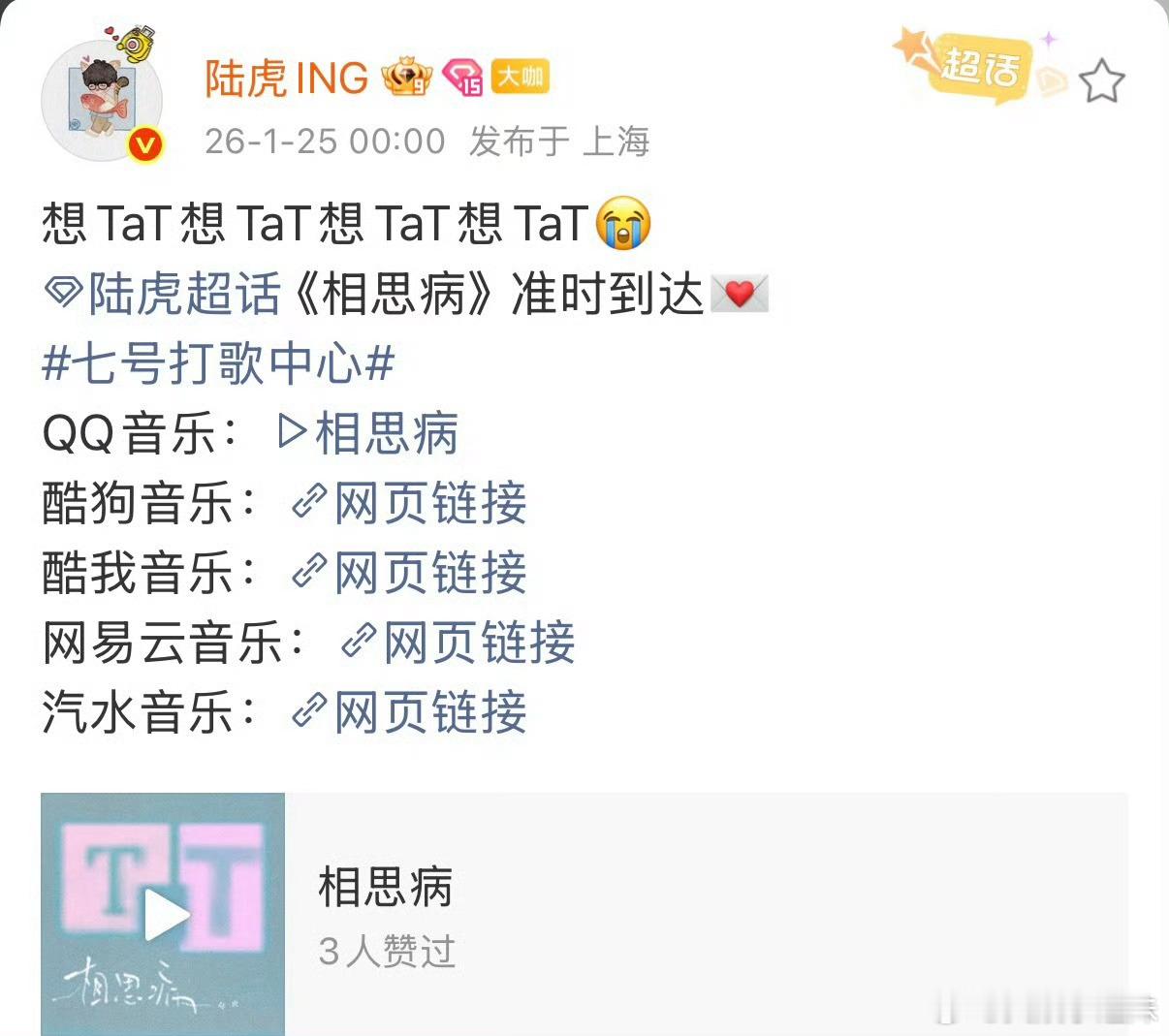 陆虎我们不说浪漫我们说TaT 陆虎式浪漫太戳人!是浪漫会像线面一样繁殖的歌手,新歌《相思病》娓娓道来,封面TaT的流泪符号引粉丝好奇,满是藏不住的细腻~