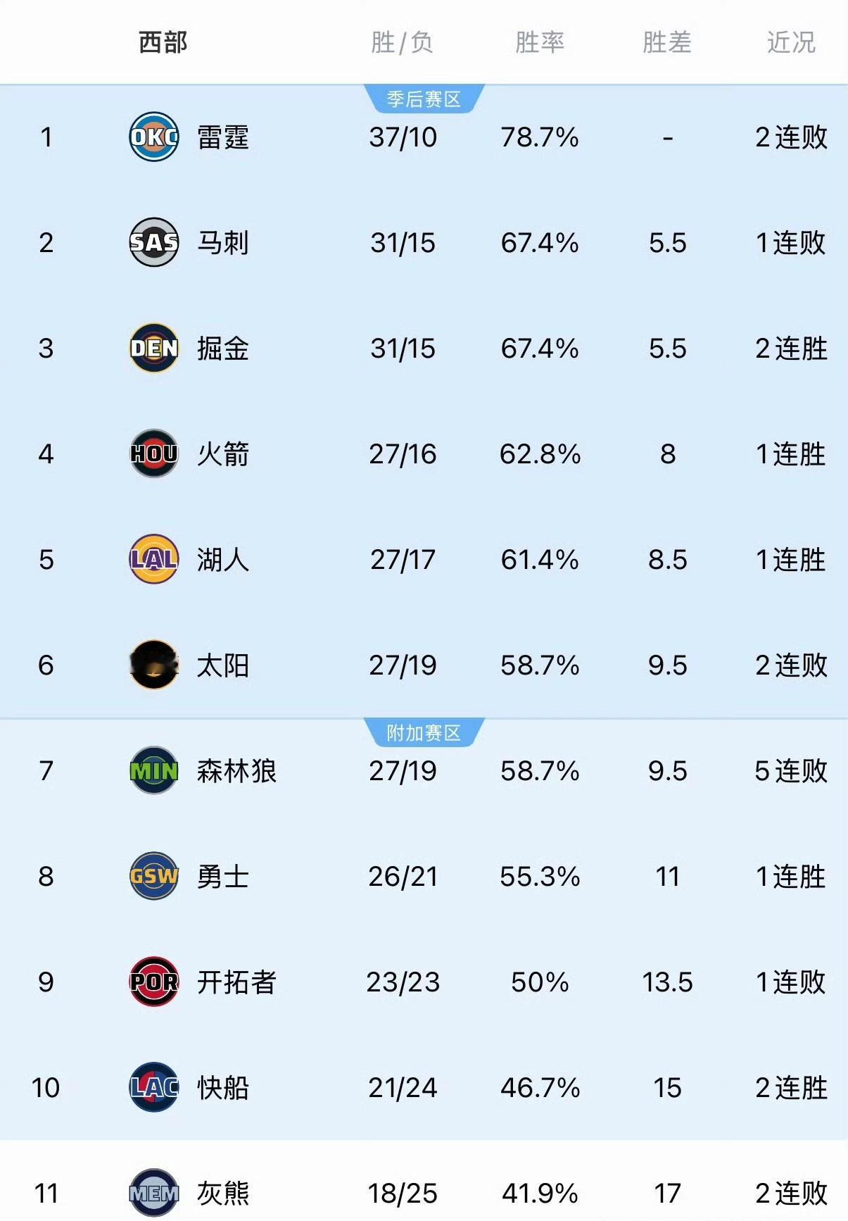 一个月前快船还只是想进附加赛,现在开始梦想前6了?快船近18战15胜,距离第6只有5.5个胜场差。 湖人太阳的拉胯属性,注定一切还来得及,果然太阳今天就输了,湖人六连客将是一场噩梦,估计会输到怀疑人生。 所以,你敢说快船没机会进入西部前六?