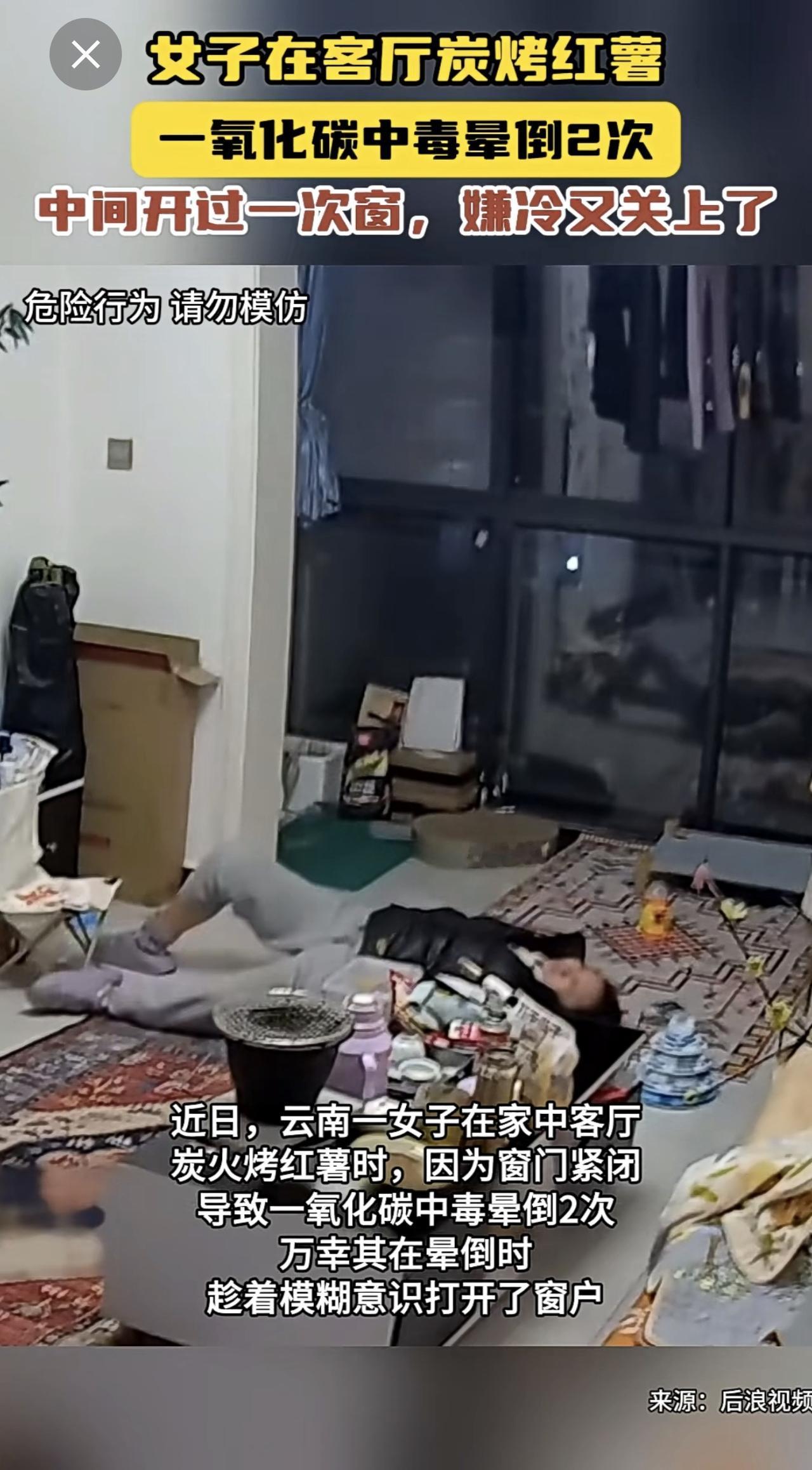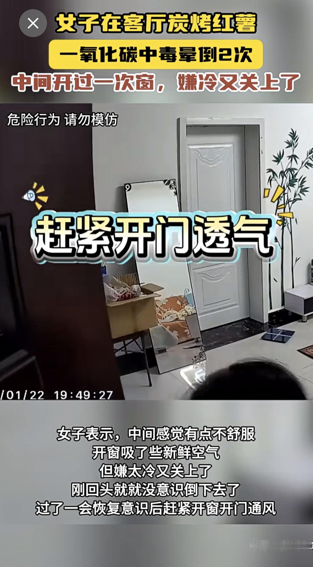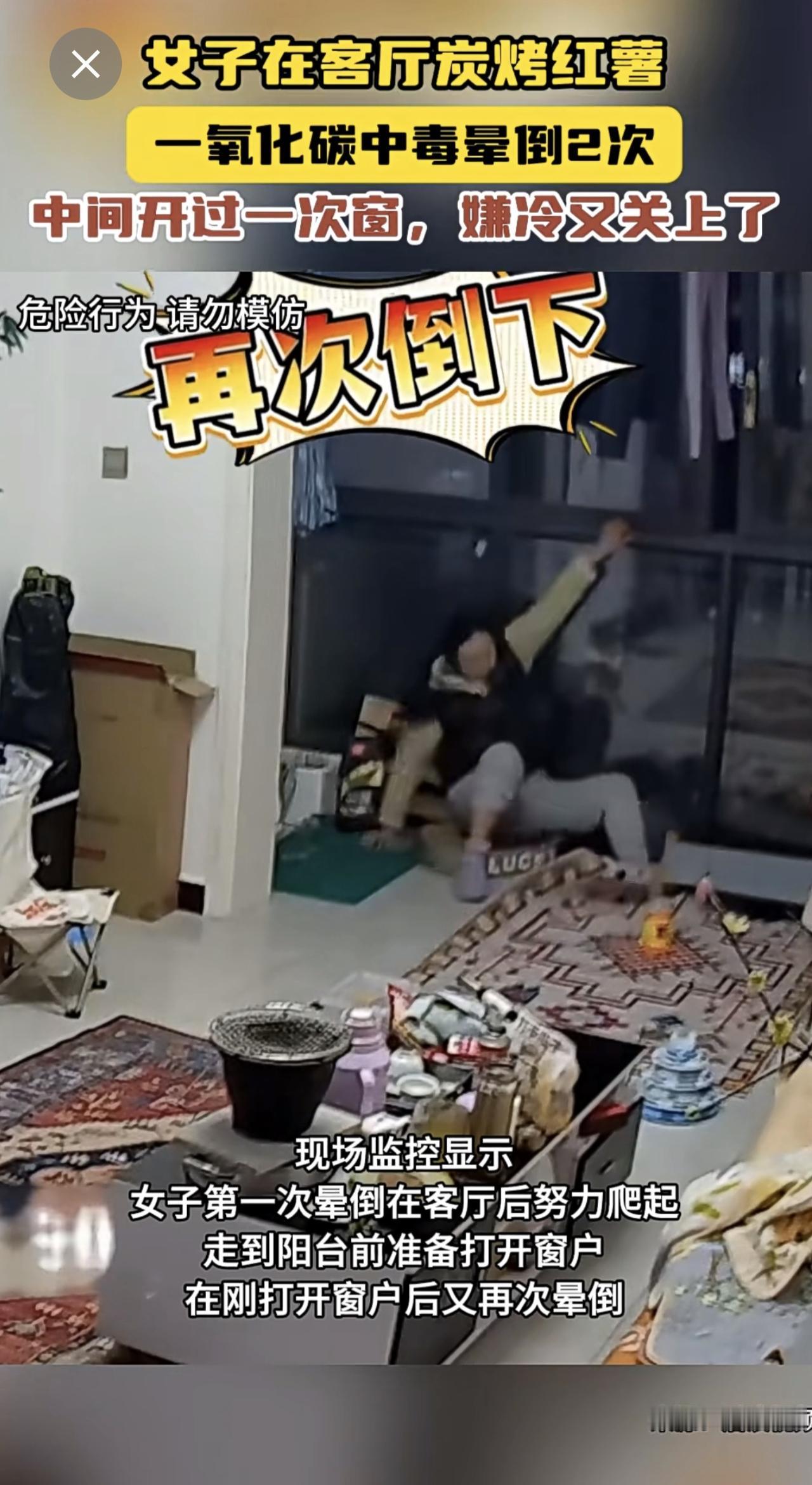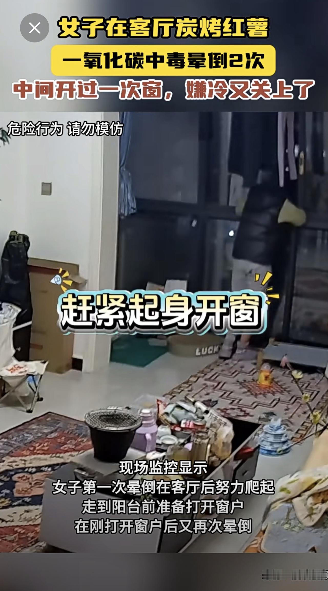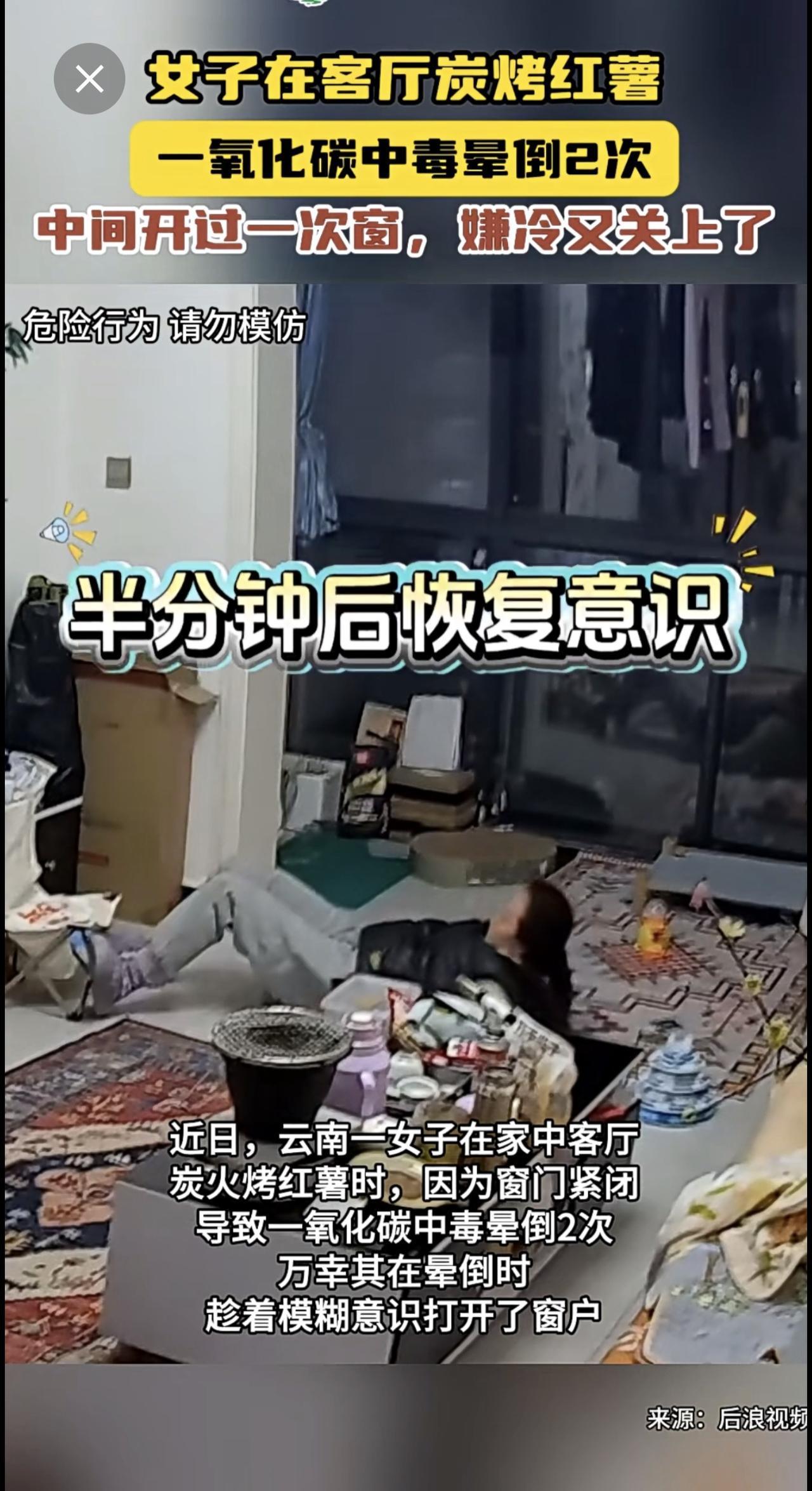 女子客厅炭烤红薯一氧化碳中毒晕倒2次 中间开过一次窗,嫌冷又关上了 社会 危险请勿模仿