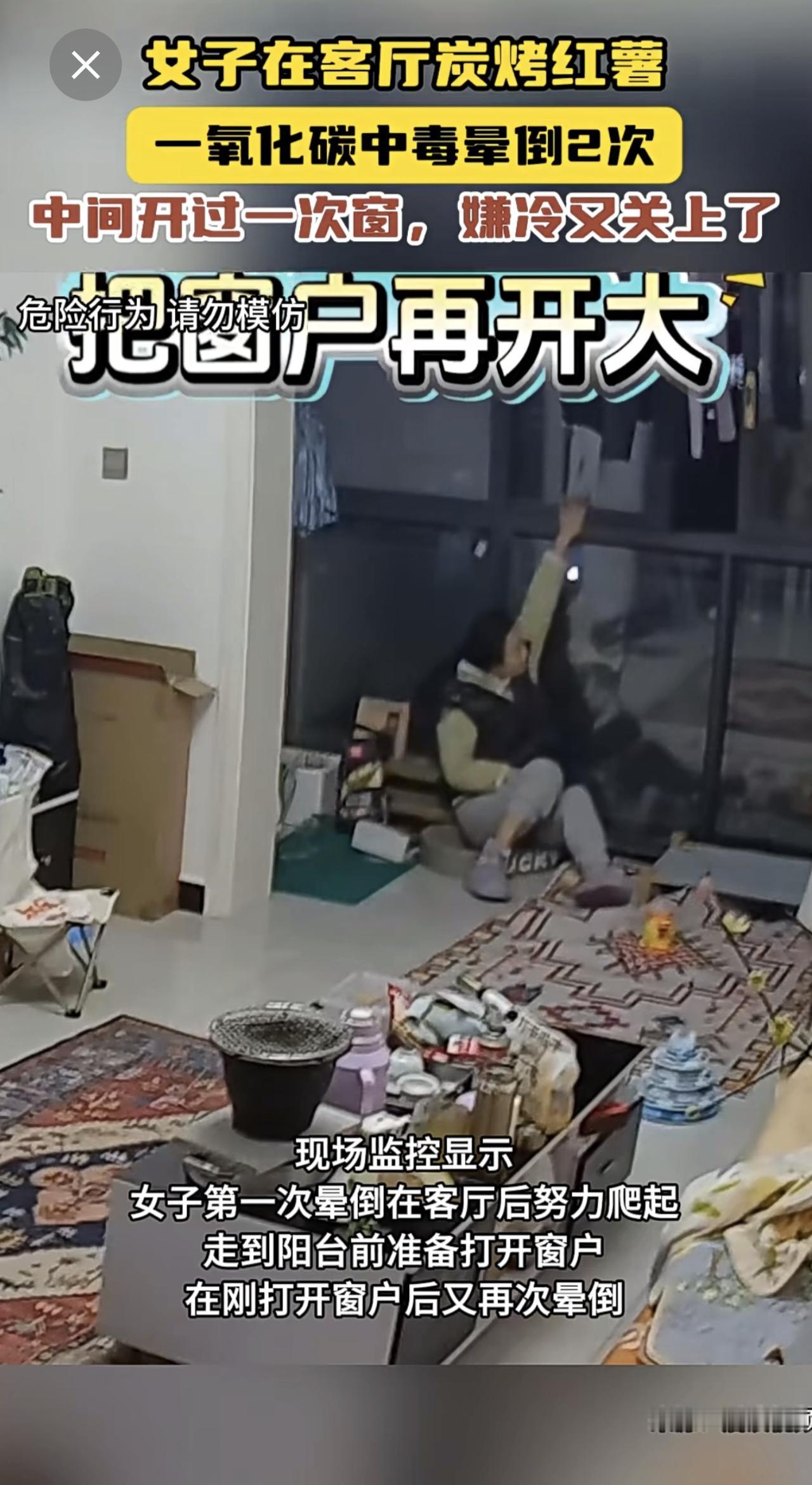 女子客厅炭烤红薯一氧化碳中毒晕倒2次中间开过一次窗,嫌冷又关上了社会危