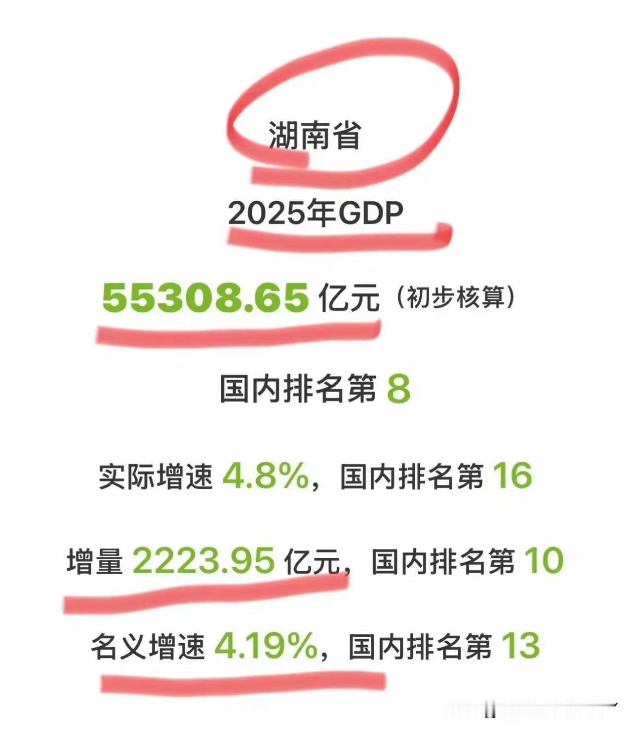 2025年湖南经济数据出炉,表现优秀。2025年湖南GDP总量为55308.7亿元,增量为2224亿元,名义增速为4.19%,超过了全国的名义增速。 这份成绩单,放在中部省份里,亮眼得很。作为中部经济版图上的重要一块,湖南的底气藏在产业里,机械工程领域早就打响了名号。 三一重工的工程机械跑遍全国工地,中联重科的塔吊在城市天际线间起落,这些“钢铁巨人”不仅撑起了地方经济,更成了湖南制造的名片。 有人说,全国基建工地里,每三台工程机械就有一台来自湖南,这话虽带点夸张,却透着实打实的实力。长沙的红火,更是给全省添了把柴。 橘子洲头的烟火一年比一年热闹,文和友里的长队从早排到晚,坡子街的臭豆腐香飘几条街。文旅产业不是简单的热闹,是把网红流量变成了真金白银。 2025年五一假期,长沙接待游客超千万,旅游收入破百亿,这种热度,不光带火了餐饮住宿,更让全国看到了这座城市的活力。 更难得的是,湖南不是“一城独大”。长沙像个领头雁,带着周边地市一起飞。株洲的轨道交通产业链越拉越长,高铁齿轮从这里运往全球。 湘潭的汽车零部件产业跟着新能源浪潮加速转型;岳阳的港口吞吐量一年一个台阶,长江岸边的货轮里,装满了湖南制造的产品。这种“中心带动、多点开花”的架势,让发展的红利流到了更多角落。 4.19%的增速,看着数字不大,可拆开来看全是干货。机械制造升级换代,文旅融合推陈出新,各地市找准了自己的定位,不盲目跟风,只埋头实干。 就像湖南人爱吃的辣椒,不追求一时的火爆,却有后劲十足的香辣,慢慢渗透到经济的方方面面。未来的路,湖南手里的牌还不少。 机械产业往智能化、绿色化转,文旅产业从“网红”变“长红”,各地市的协同发展再紧一紧,说不定还能跑出更快的速度。毕竟,踏实肯干的劲头在,又有清晰的产业路数,这样的湖南,想不发展好都难。 这份经济答卷,是给过去的总结,更是给未来的底气。湖南的优秀,不止在数字里,更在那股子不服输、往前冲的劲儿里。