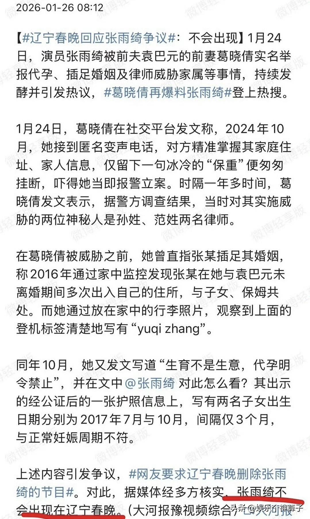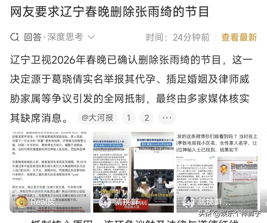 有点担心张雨绮! 如果再这样下去,参加辽宁春晚估计要泡汤了! 这几天,葛晓倩持续爆料,态度很坚决,有点不依不饶的架势,然而,张雨绮并没有正面回应。 尽管好友杨天真晒出照片,试图帮张雨绮辟谣,仍然没有解决问题。 1月25日,一大早,葛晓倩再次发文,质疑张雨绮不敢晒出生证明,咱就说,也是遇到硬茬了,看这意思,要硬刚到底。 感觉张雨绮继续保持沉默,也不是办法,当然,如果就是不予理睬,对方没有实锤,也不能咋滴。 关键是,网友现在开始抵制,甚至要求辽宁春晚删除张雨绮的节目,这样下去,可能真的要泡汤了。 正所谓,行的端,做的正,就无所畏惧网上的爆料,还不如大大方方的回应,解除大家的疑惑。