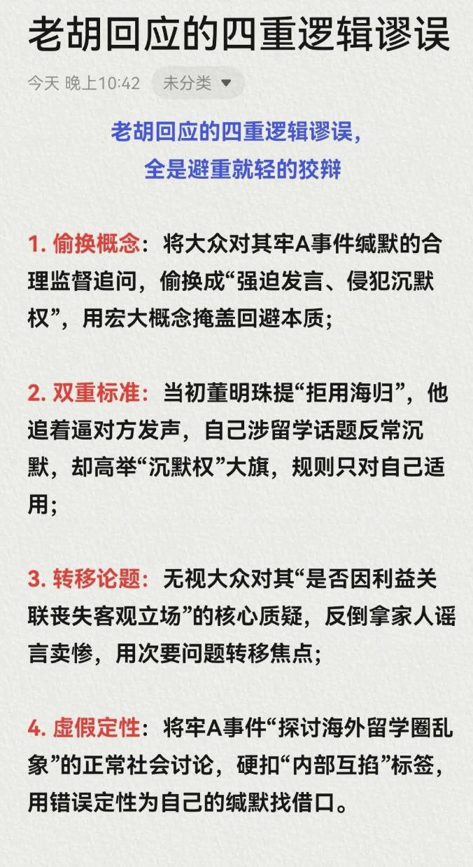 老胡赖不掉了,网络是有记忆的,看看当初他是怎么要求董大姐的。 之前,是反复纠缠,要求董大姐出面道歉。现在,轮到自己了,就变成了有保持沉默的权利。 还提到什么网络皿煮。敢情皿煮是老胡的要饭盆儿,自己要吃饭了就端出来。 图三是网友的分析,说的太对了,老胡避重就轻,就是不敢提斩杀线,不知为何?
