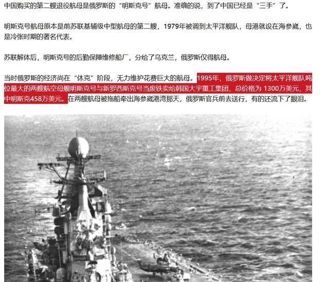 1995年,俄罗斯将2艘航母以1300万美元价格,当废铁卖给韩国,可就在航母即将