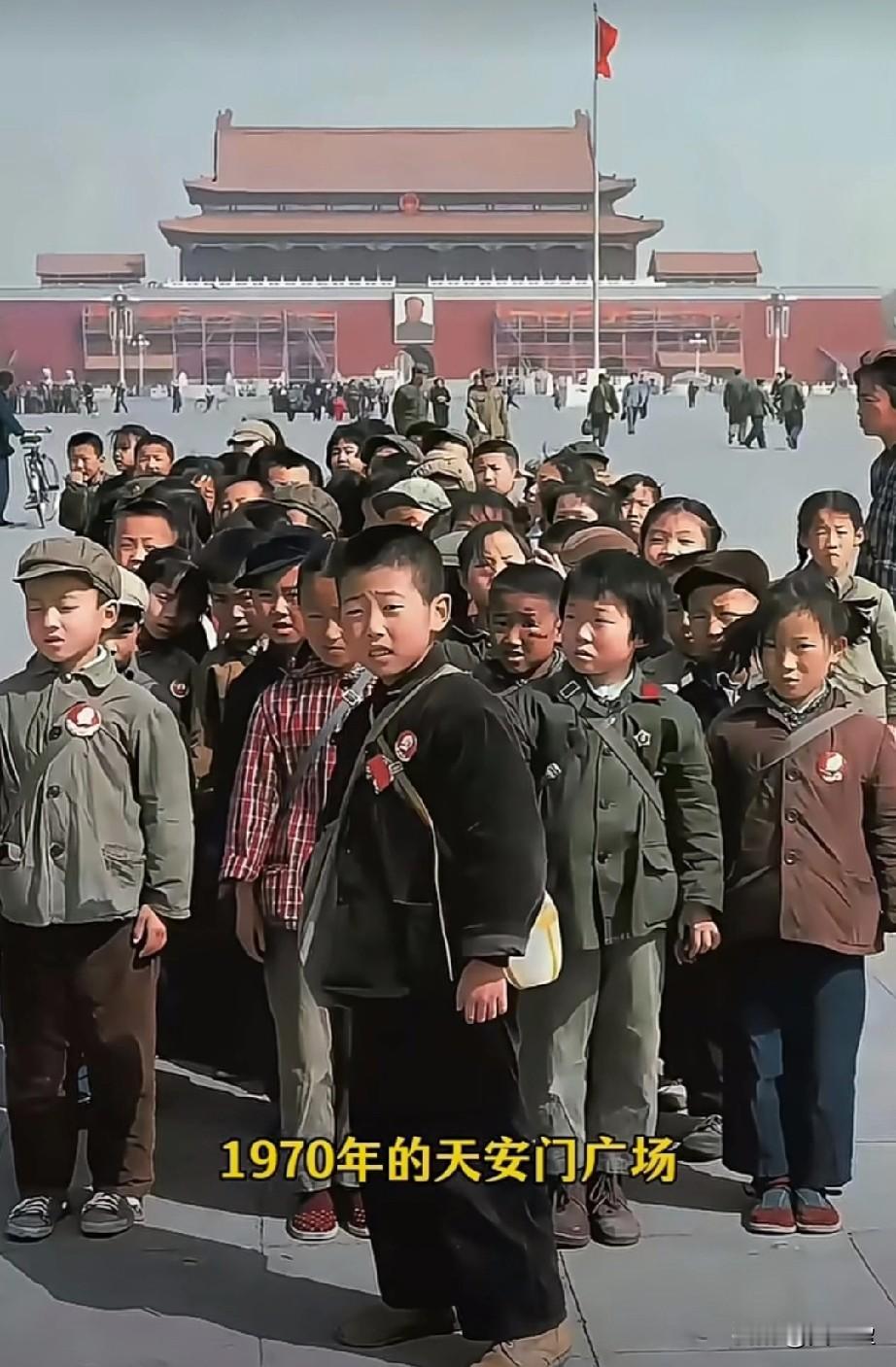 一张很有年代感的老照片。 1970年的天安门广场,一群孩子穿着朴素的衣服整齐列队,胸前的像章带着鲜明的时代印记。 脚下的皮鞋是家境优渥的佐证,在那个物资匮乏的年代,这样的细节藏着属于他们的特殊印记。