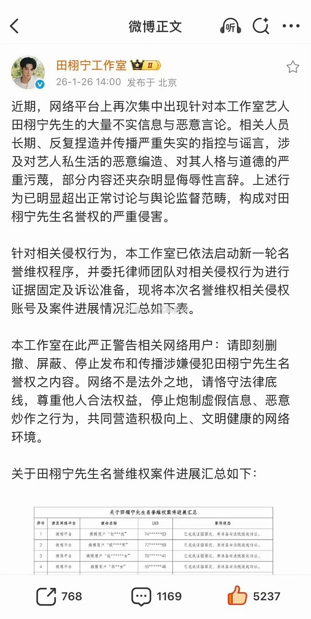 田栩宁工作室发布告嘿名单了