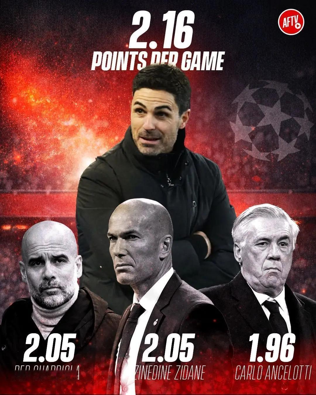 阿尔特塔带队踢欧冠,平均每场能拿2.16分,这成绩是欧冠历史上最高的!这个数据比瓜迪奥拉、齐达内的2.05分还高,也超过了安切洛蒂的1.96分。塔子哥的欧冠执教水平是真的强,该给他足够的尊重。