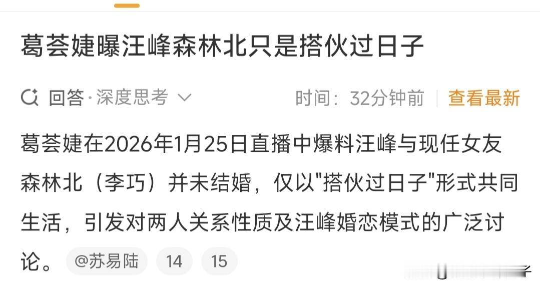 汪峰看到葛荟婕的爆料,估计要被气晕了吧! 1月26日,葛荟婕上了热搜,毫不意外,这一次,又跟汪峰有关,看到内容,瞬间引发网友热议。 葛荟婕在直播时爆料,称汪峰和森林北没有结婚,还说两人只是搭伙过日子,这……,话说的有点难听,貌似在暗指人家没有感情。 说实话,以前因为了解葛荟婕的经历,还有些同情,如今,张口就来,真的有点让人讨厌,再不收敛一点,网友都看不下去了,最后把好人缘都败光了。 咱就说,就算有网友提出问题,但凡情商高一点,完全可以假装看不见,关键是,两人没有结婚,这是大家都知道的事,蹭热度的意图,有点过于明显。 汪峰看到爆料,估计要气晕了吧,这样说人家,让森林北怎么想。 各自都有生活,彼此互不打扰,才是明智的选择,汪峰和森林北已经很低调了,还好不跟葛荟婕计较,不然,也挺麻烦。