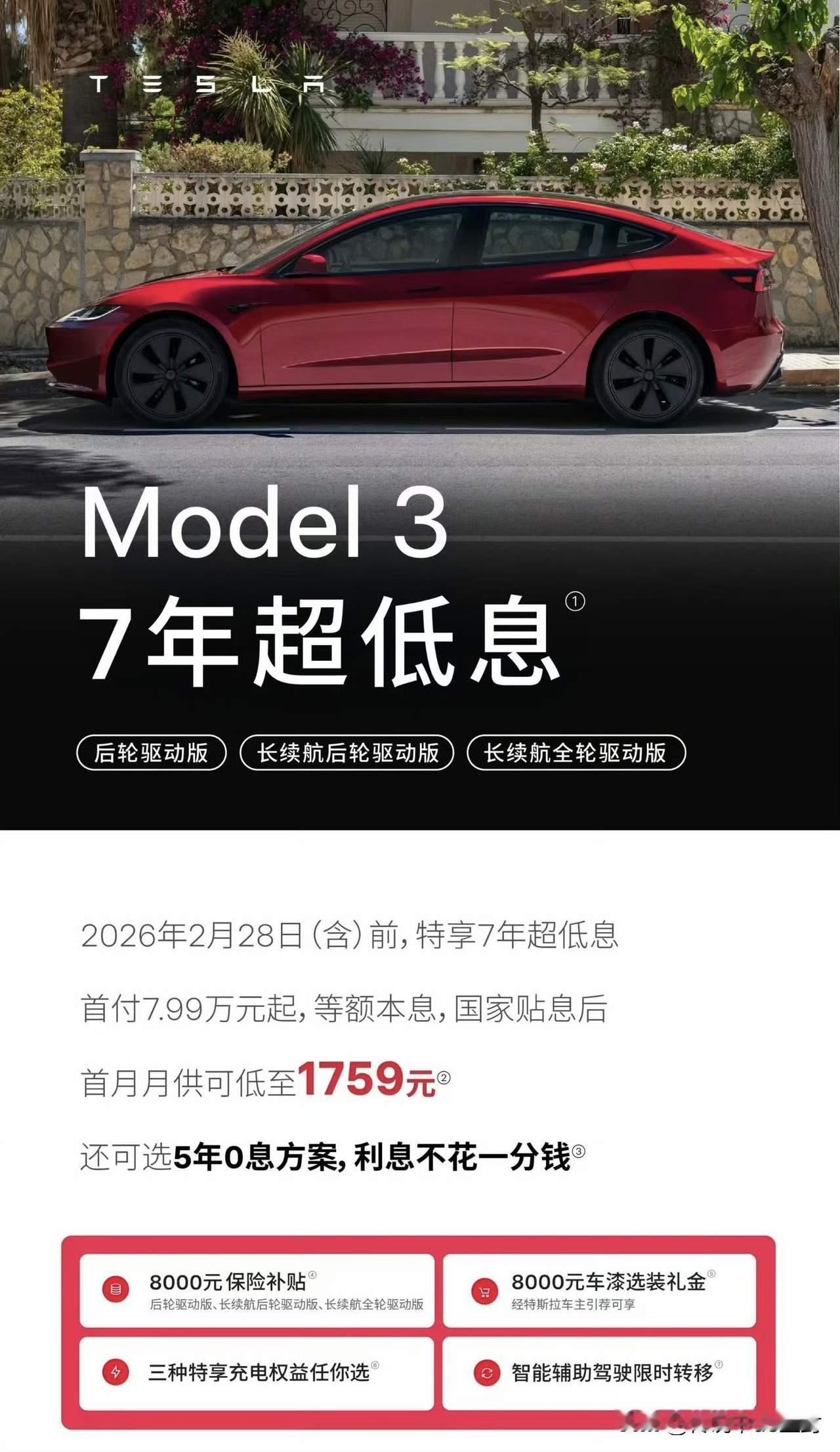 2026留给特斯拉的,只有降价和降配了… 看到特斯拉保险优惠8000,其实就是变相降价8000,意料之中的事情,购置税和国补滑坡的杀伤力还在延续,很多消费者要么年前买了,要么都在观望,不仅特斯拉,其它国产车都难。 但是国产车可以更新迭代,增加核心配置,加量加价,消费者也能接受。 但是特斯拉不一样,特斯拉和苹果手机一样,一年就一两款产品打天下,产品不会那么快更新迭代,最多是小改款,基本站着挨打,所以降价基本是唯一出路,韩国那边已经降价,国内某些原因不降价,但是也会降低大家入手门槛比如七年超低息。 另外就是进一步降低成本和售价,比如推出廉价版本的特斯拉,这是一条和国产车背道而驰的路子,在别人都彩电冰箱大沙发下放的时候,敢这么做的估计也只有特斯拉了。 我估计舒适性进一步减配,续航减配,但是智驾会保留硬件,不排除FSD以后订阅收费,成为新增长来源。