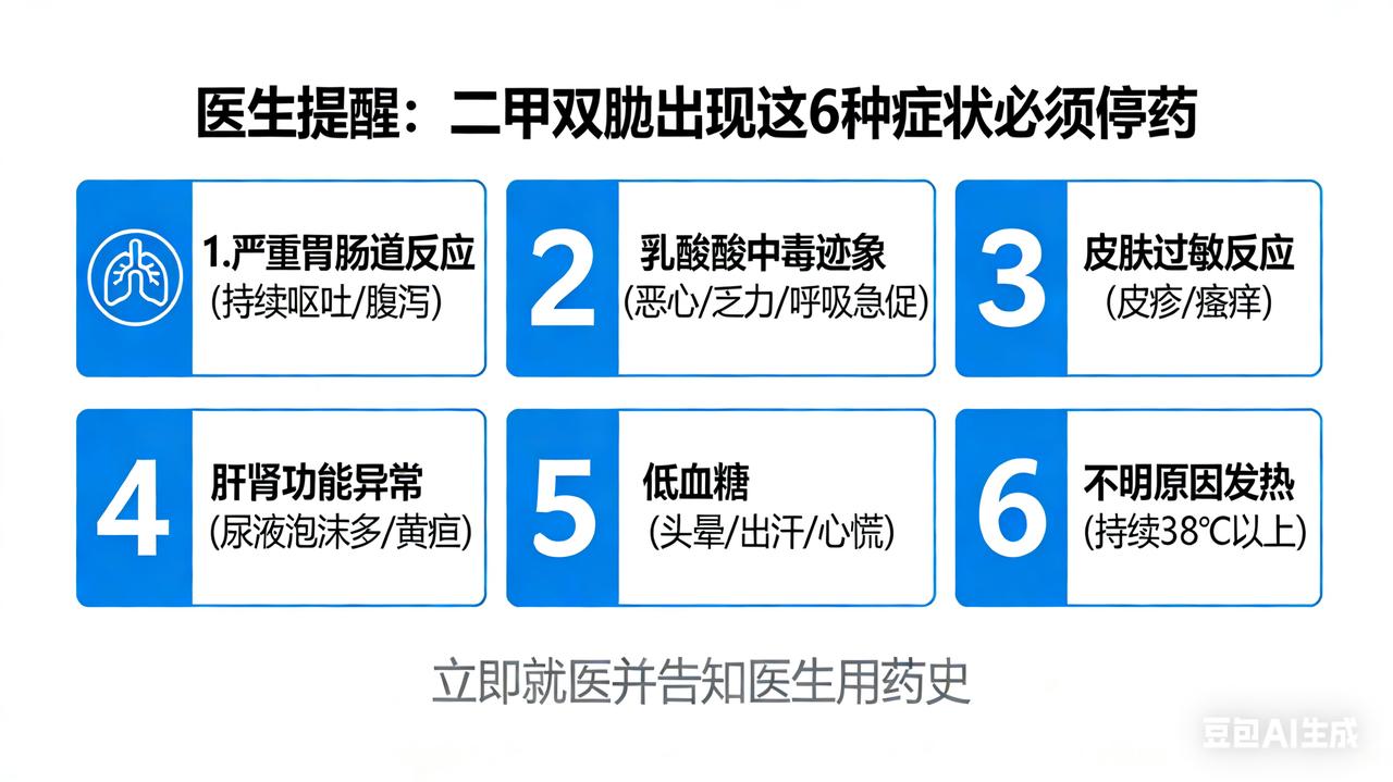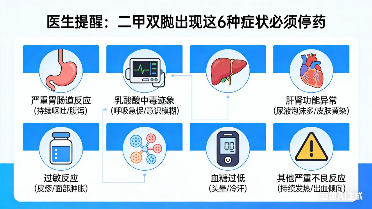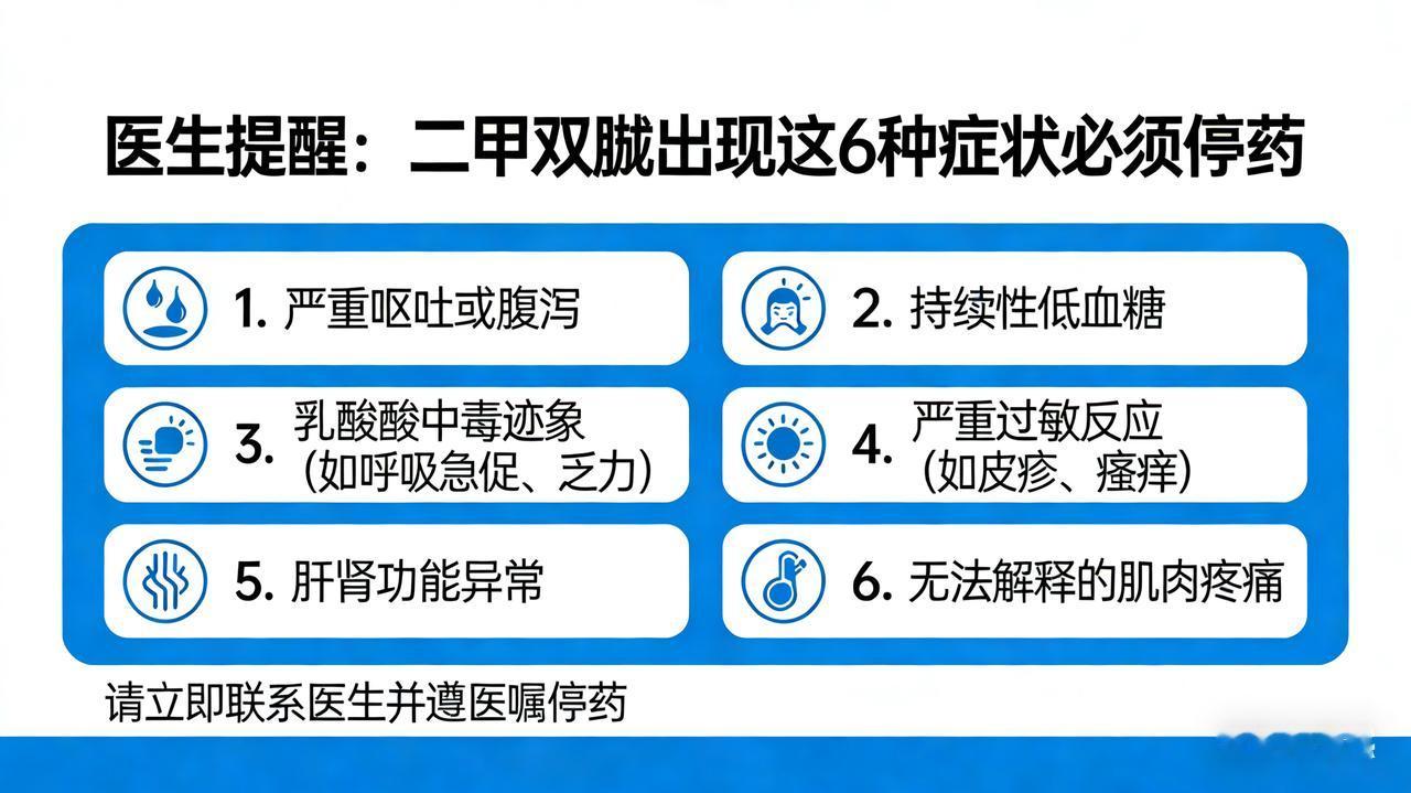 医生提醒:二甲双胍出现这 6 种症状必须停药 医生紧急叫停!服用二甲双胍若现这6大征兆,立刻停药别犹豫 二甲双胍虽是控糖基石,但绝非“万无一失”。作为临床医生,我们必须发出最高级别警示:是药三分毒,当身体出现以下6种“红色警报”时,继续服药无异于“服毒”,必须立刻停药并急诊就医! 1. 呼吸困难的“窒息感”(乳酸性酸中毒): 这是最致命的副作用。若出现深大呼吸(Kussmaul呼吸)、极度乏力、肌肉酸痛伴嗜睡,这是乳酸在体内堆积导致代谢性酸中毒的信号,死亡率极高,必须分秒必争停药抢救。 2. 剧烈的“胃肠崩溃”: 普通的恶心腹泻尚可耐受,但若出现持续性剧烈呕吐、严重腹痛或水样腹泻,导致脱水、电解质紊乱甚至体重骤降,说明胃肠道黏膜已严重受损,强行服药会引发穿孔风险。 3. 莫名的“冷汗与颤抖”(严重低血糖): 单用二甲双胍虽少见低血糖,但若联用胰岛素或磺脲类药物,一旦出现心慌、手抖、冷汗直冒甚至意识模糊,必须立刻停药补糖。低血糖的脑损伤比高血糖来得更凶猛。 4. 肾脏的“沉默求救”: 二甲双胍经肾排泄,若发现尿量骤减、眼睑或下肢浮肿、血肌酐异常升高,或肾小球滤过率(eGFR)低于45ml/min,意味着“排毒通道”堵塞。此时不停药,毒素积蓄将直逼尿毒症。 5. 手脚的“蚁行感”(B12缺乏): 长期服药会阻碍维生素B12吸收。若出现手脚麻木、刺痛、行走如踩棉花感,这是周围神经病变的征兆。若不停药并补充营养,神经损伤往往不可逆。 6. 皮肤的“过敏风暴”: 哪怕只是皮疹、瘙痒,若伴有喉头水肿或呼吸困难,这是过敏性休克前兆,必须立即停药并抗过敏治疗,切勿因症状轻微而侥幸。 用药是为了救命,而非冒险。请将这6条铁律转发给身边的糖友,关键时刻能保命!