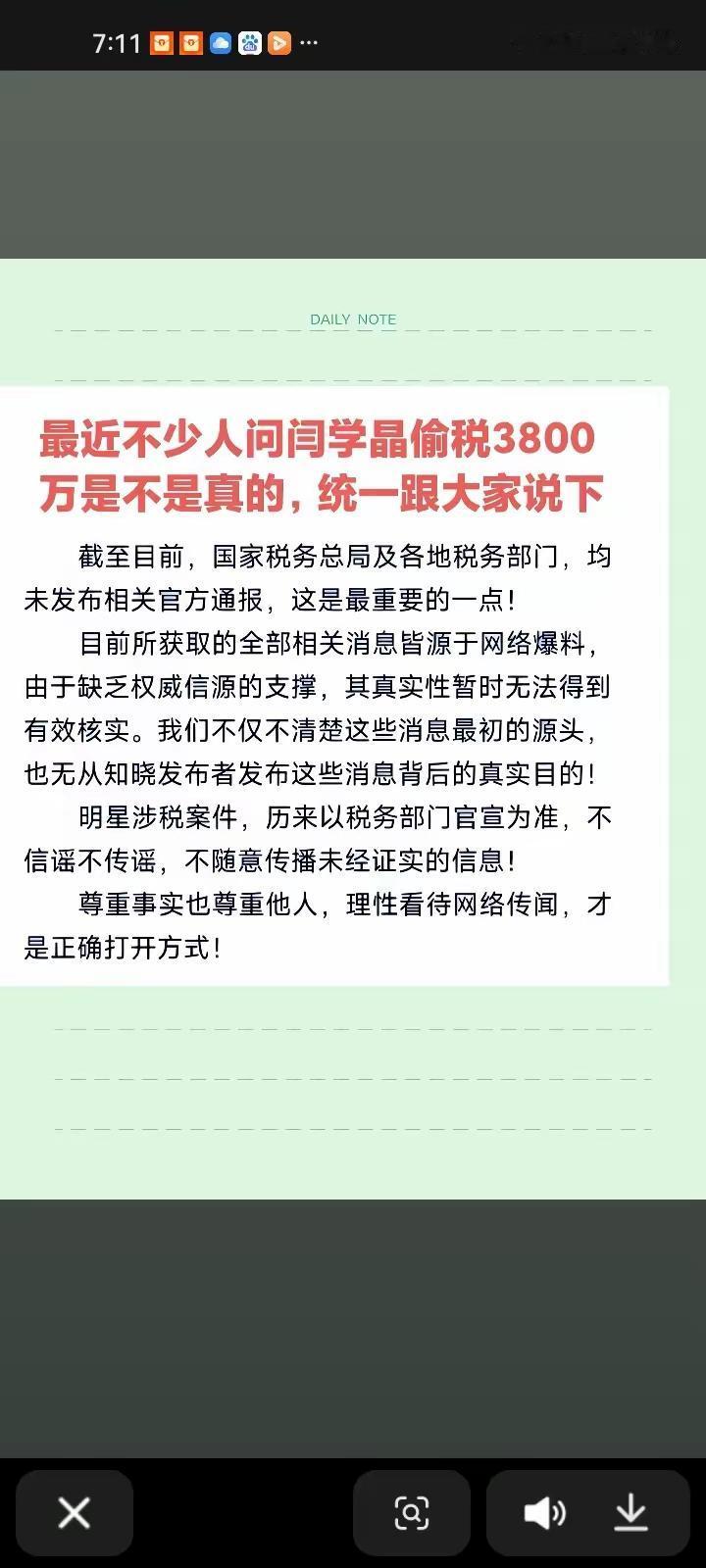 闫学晶被网传偷税漏税3800万,加上滞纳金和罚款得交1.2亿,是真是假? 旦愿这不是事实,虽说免除了刑事责任,说到底还没达到坐牢有程度,但这事儿影响可不小,如果当真估计她也真成了“酸黄瓜”了!这事只是网传,并无相关税务部门发布的信息。 但3800万可不是小数目,普通老百姓几辈子都赚不到。这只是应交税款,那明星到收入多高,明眼人都能推算出来。这“苦穷”可把这些“酸黄瓜”苦醒了,扒一扒她到底穷不穷?挣钱再多,应该遵守法律好好纳税。现在她这“吃酸黄瓜”的局面,也是自食恶果。这也给其他明星提了个醒,别为了钱就耍小聪明偷税漏税,诚信纳税是基本的,不然哪天东窗事发,名声和钱财都得受损,到时候后悔可就来不及了。 对闫学晶这事的结果,也有网友提出质疑,认为不应盲目宣传和散布不实消息,应以国家税务局和地方税务局发布的消息为准。 笔者认为,的确应该尊重事实,在相关部 发布处罚决定后,才能客观公正认定,闫学晶问题真正性质。 跨界女王闫学晶 闫家晶 闫寒晶 闫晶明