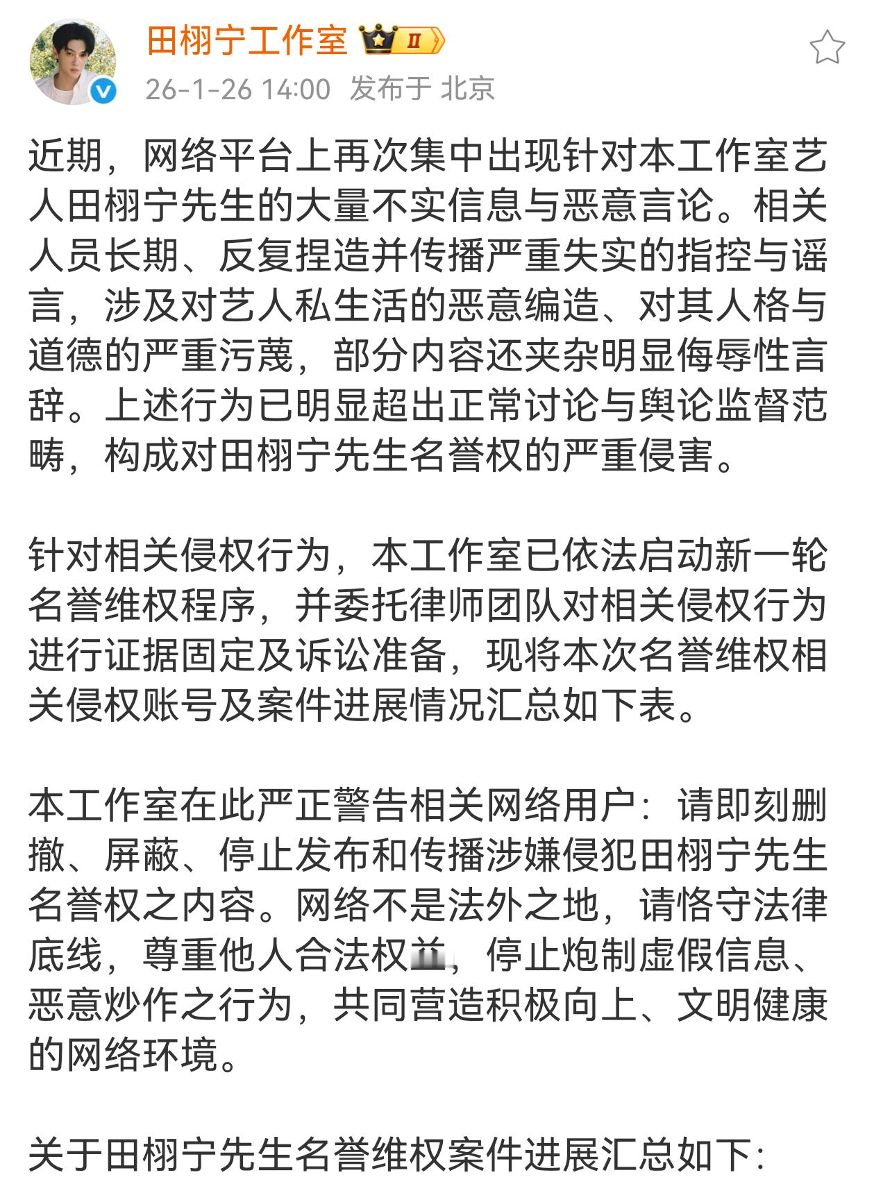 田栩宁工作室发布告黑进展,爽!!!!田栩宁工作室发告黑进展
