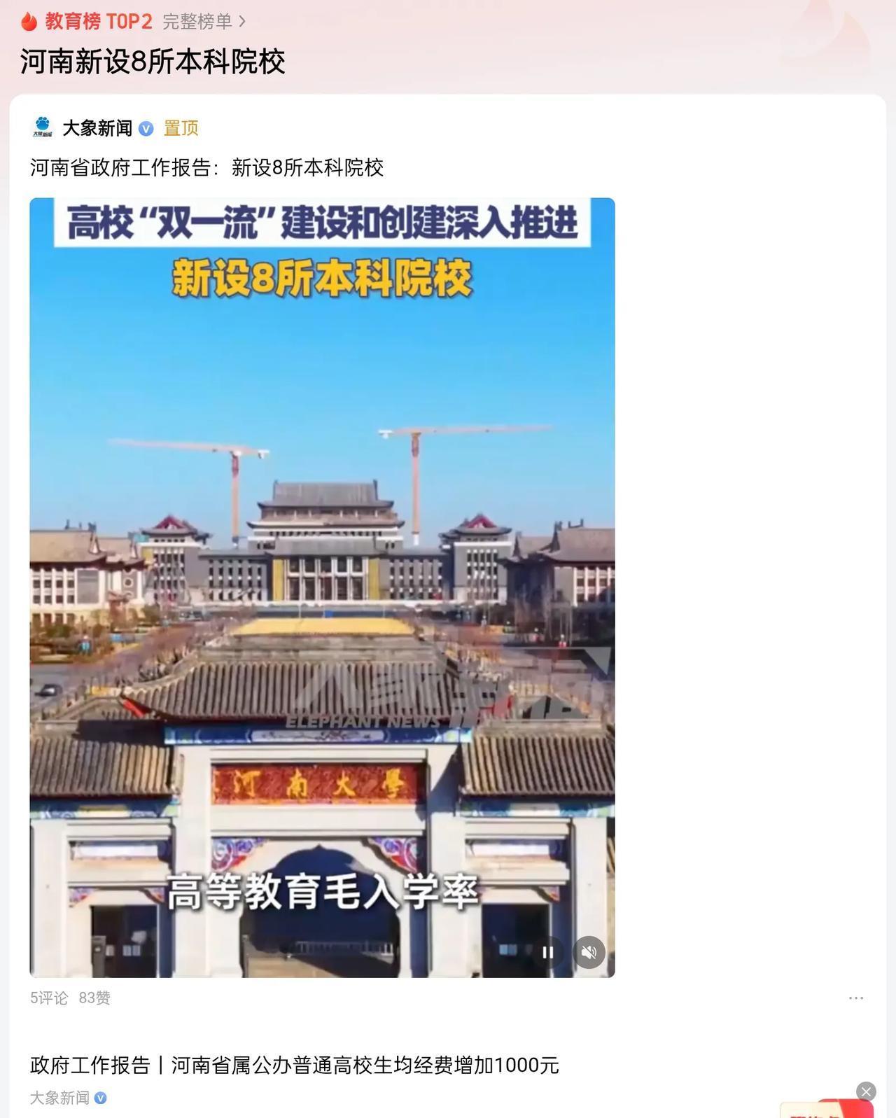 厉害了,去年59%,今年能到67%! 河南发布通报,新增八所本科院校,高等教育毛入学率提高8个点,从59%直接干到67%! 这也就意味着上大学的适龄人口。有2/3都拥有了大学学历 甭管是本科的还是专科的,不管是公办的还是民办的,只要是在这个年龄段的,有2/3的人都要上大学了! 河南我们知道,山河四省当中,考生人数最多,高考压力最大的一个省份 现在根据最新的报告,河南将新拥有四所本科院校,这四所本科院校可以吸引更多的人来报考,使得省内的高等教育毛入学率有较大幅度的提升。 按照这个形势来看,将来人人上大学这已经不是一个梦想,是很快就能变成现实的准现实了。 为河南学子祝福,恭喜他们。