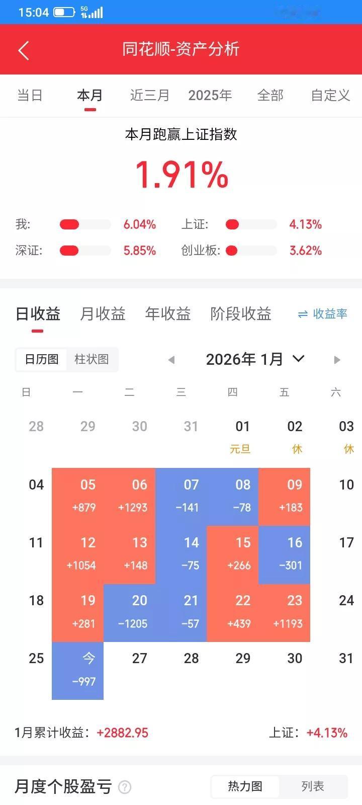 2026.01.26,今天又是一个悲催的日子,持有的股票全面大跌,收盘拉起来一些,卖掉的上涨了,持有的却下跌。 前几天被互联网etf的假阴线骗了,假阴线也是阴线,舍不得卖,今天又下跌了,还是亏损了,收盘以0.896清仓卖掉5000股,放弃了,集中资金做别的,通信设备etf也是,星期五的假阴线,觉得反弹上涨了,忽视了风险,今天大跌,还是按照规则执行,亏了也要认了,愿赌服输,收阴线卖掉,收盘以1.323卖掉前几天补仓的5000股,留下2000股底仓。 长鸿继续下跌,收阴线,继续等待,星期五还是卖对了。 太阳今天低开低走收阴线,前几天买错了,及时止损认错,收盘以9.43卖掉前几天买的300股,留下100股底仓,又多亏了几十块钱。 上能今天低开冲高回落,星期五大跌都拉起来,就是诱多,今天大跌,收阴线,大亏了几百块钱,收盘以39.25清仓卖掉400股,愿赌服输,没有延续涨势就要及时离开,避免连续下跌造成大亏明天上涨就再重新买回来。 金森今天高开高走,很快又涨停,看到20多万手封单,以为涨停稳了,想下个开板卖出的条件单,但是还没有来得及就破板下跌了,下跌又幻想会再封板,一直舍不得卖,越跌越低,最低跌到12.49,好想12.50卖掉算了,也可以保住部分利润,但是还是管住了手,没有卖,跌停就算了吧,收盘再卖,收盘却突然拉起来,但是还是收阴线,还是应该卖掉,收盘以13.40卖掉400股,留下100底仓。今天打板的最多亏了百分之十几,还好,我不追高,亏损有限。 株冶又错过了,今天又是大涨。放弃了。 今天总市值0.637万元,总资产5.573万元,今天从开盘赚几百块钱到最多亏了一千五百多,到收盘拉起来一些,还是总体账户亏损997元,把星期五回本的差不多都回撤回去了,赚了一把浮盈而已。