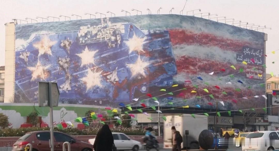 伊朗硬刚美国!壁画怼航母“血流成河”,美军航母已抵阿曼湾 伊朗直接给美国上了硬菜,德黑兰革命广场新揭幕的壁画把美军航母画得惨不忍睹。 壁画是俯视视角,航母甲板上战机东倒西歪,红色痕迹爬满甲板和周边海水,拼出美国国旗的模样,配着“种下风者必收获风暴”的标语,明晃晃叫板美军。这还不算完,伊朗高官直接放话,任何形式的攻击都算全面战争,伊朗军队早备好应对最坏情况。 美军这边也没闲着,“林肯”号航母已抵达阿曼湾,之前特朗普口风变软纯属摆谱,压根是等航母这波救兵。美国一边增兵中东,一边搞经济制裁,伊朗货币崩盘通胀飙升,却硬气到底,导弹部队进入最高战备,2000多枚导弹能覆盖中东。 说到底,特朗普想靠对外强硬拉选票,伊朗则用壁画和狠话拿捏底线。双方就像两头憋着火的公牛,就等谁先踩线。 这波针尖对麦芒的较量,最后是打起来还是各退一步?评论区来聊聊。