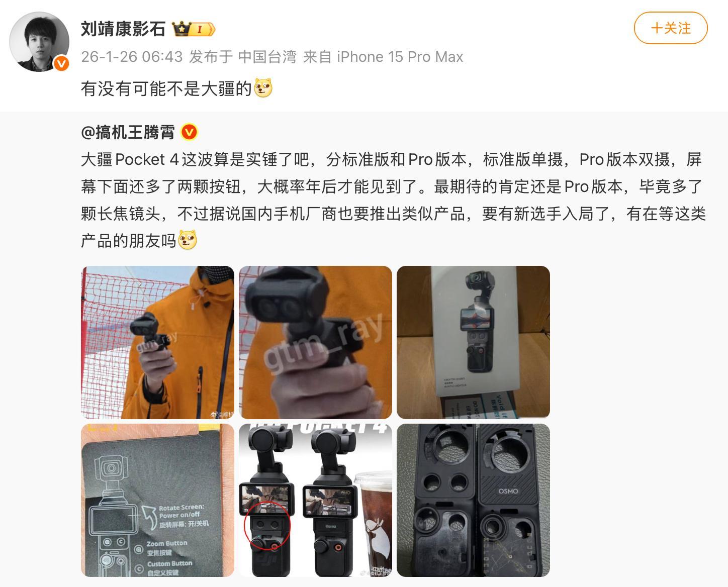 哦?最近网上传闻得很热门的所谓曝光的大疆Pocket 4,难道还真不是?影石老板表示,有没有可能这不是大疆的。这么说,确实有可能,影石也是有可能的,毕竟这两家是正面对标~双镜头的便携云台相机,不知道最终落地是啥表现。不过今年这一块的市场,应该也会有不小的竞争。还不止这两家,不是也传闻了有几个手机厂商也要入局呢。另外荣耀的ROBOT PHONE也属于会跟这类形态有交集的。春节后应该也快登场了吧。热闹起来~