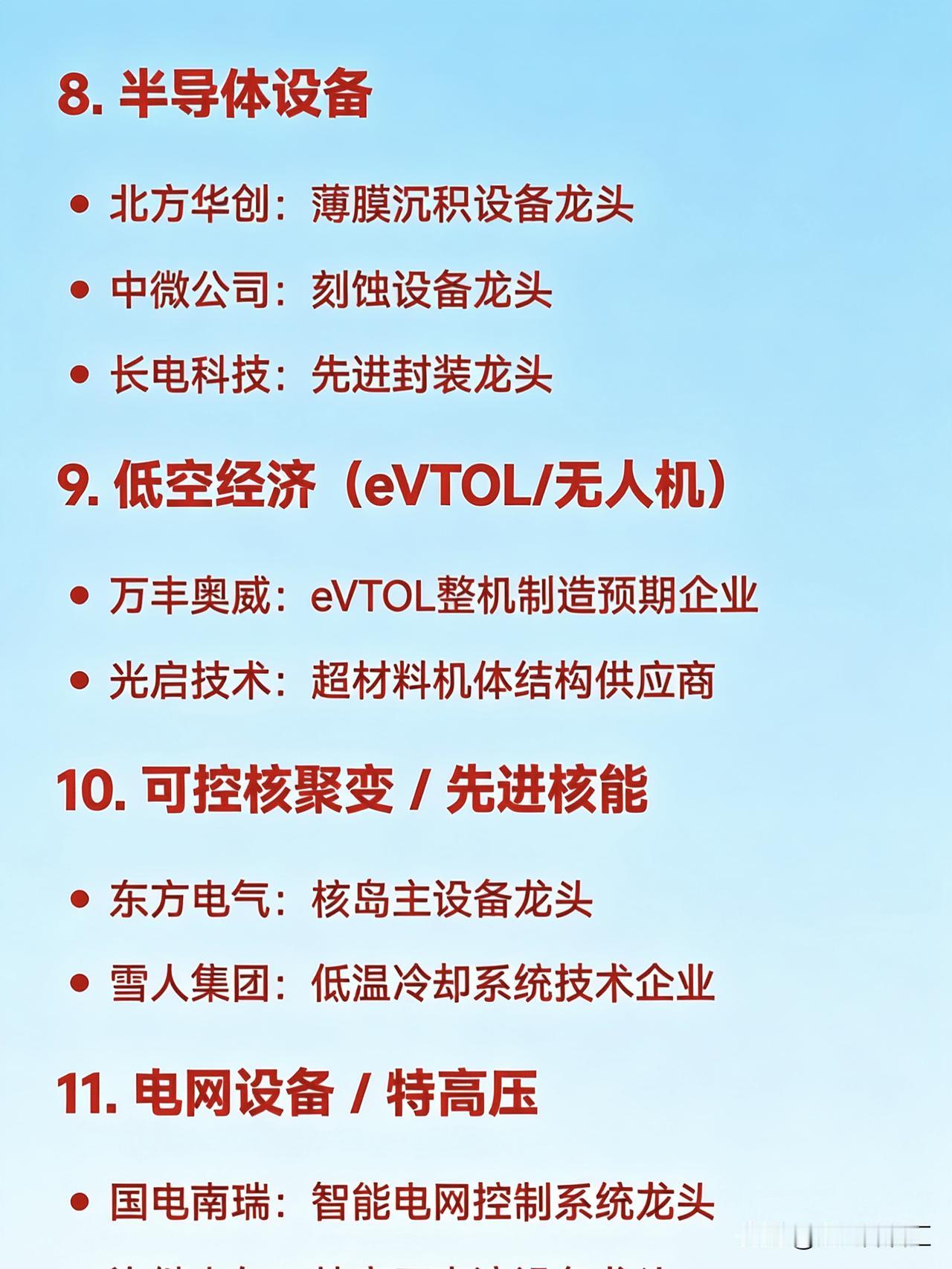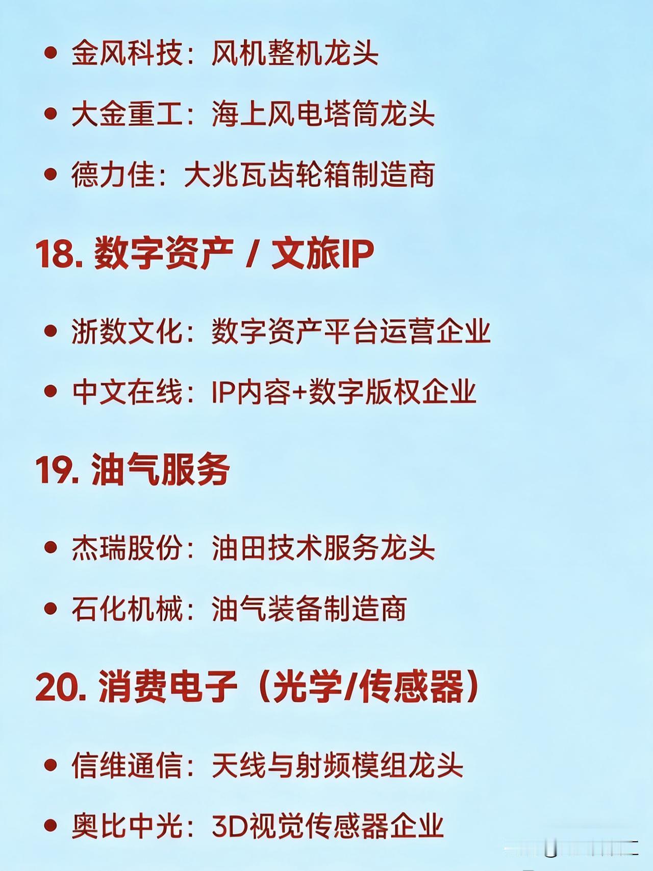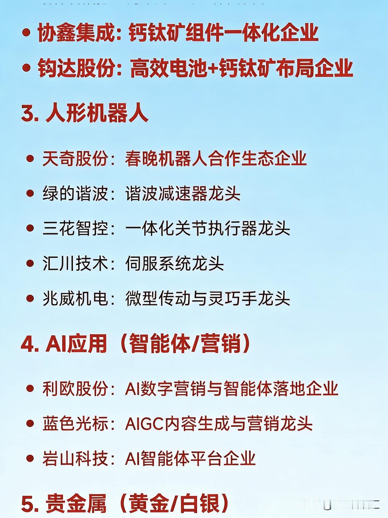 2026年1月26日二十大热点概念核心企业 1. 商业航天 航天电子:卫星配套系统龙头 中国卫星:卫星总体研制龙头 巨力索具:火箭结构件龙头 中超控股:航天连接器龙头 超捷股份:火箭箭体制造龙头 2. 钙钛矿电池 东方日升:钙钛矿+HJT叠层技术领先企业 拓日新能:钙钛矿电池研发代表企业 协鑫集成:钙钛矿组件一体化企业 钧达股份:高效电池+钙钛矿布局企业 3. 人形机器人 天奇股份:春晚机器人合作生态企业 绿的谐波:谐波减速器龙头 三花智控:一体化关节执行器龙头 汇川技术:伺服系统龙头 兆威机电:微型传动与灵巧手龙头 4. AI应用(智能体/营销) 利欧股份:AI数字营销与智能体落地企业 蓝色光标:AIGC内容生成与营销龙头 岩山科技:AI智能体平台企业 5. 贵金属(黄金/白银) 白银有色:白银冶炼综合龙头 湖南白银:伴生银资源企业 山东黄金:黄金采掘龙头企业 6. 光伏设备 / 高效电池 隆基绿能:BC电池与组件全球龙头 捷佳伟创:HJT整线设备龙头 迈为股份:异质结设备龙头 7. 固态电池 / 新型储能 宁德时代:全固态电池研发领先企业 亿纬锂能:半固态电池量产推进企业 格林美:电池材料回收龙头 8. 半导体设备 北方华创:薄膜沉积设备龙头 中微公司:刻蚀设备龙头 长电科技:先进封装龙头 9. 低空经济(eVTOL/无人机) 万丰奥威:eVTOL整机制造预期企业 光启技术:超材料机体结构供应商 10. 可控核聚变 / 先进核能 东方电气:核岛主设备龙头 雪人集团:低温冷却系统技术企业 11. 电网设备 / 特高压 国电南瑞:智能电网控制系统龙头 许继电气:特高压直流设备龙头 平高电气:高压开关设备龙头 12. 存储芯片 佰维存储:嵌入式存储模组龙头 德明利:主控芯片+SSD方案企业 13. 新能源汽车(三电系统) 比亚迪:整车+三电一体化龙头 精进电动:电驱动系统供应商 14. 算力基础设施(液冷/服务器) 中科曙光:液冷智算中心龙头 英维克:液冷散热方案提供商 15. 生物疫苗 / 创新药 华兰疫苗:流感疫苗龙头企业 之江生物:分子诊断与疫苗研发企业 16. 化工新材料 红宝丽:环氧丙烷衍生材料龙头 澄星股份:精细磷化工企业 17. 风电(海风/大兆瓦) 金风科技:风机整机龙头 大金重工:海上风电塔筒龙头 德力佳:大兆瓦齿轮箱制造商 18. 数字资产 / 文旅IP 浙数文化:数字资产平台运营企业 中文在线:IP内容+数字版权企业 19. 油气服务 杰瑞股份:油田技术服务龙头 石化机械:油气装备制造商 20. 消费电子(光学/传感器) 信维通信:天线与射频模组龙头 奥比中光:3D视觉传感器企业
