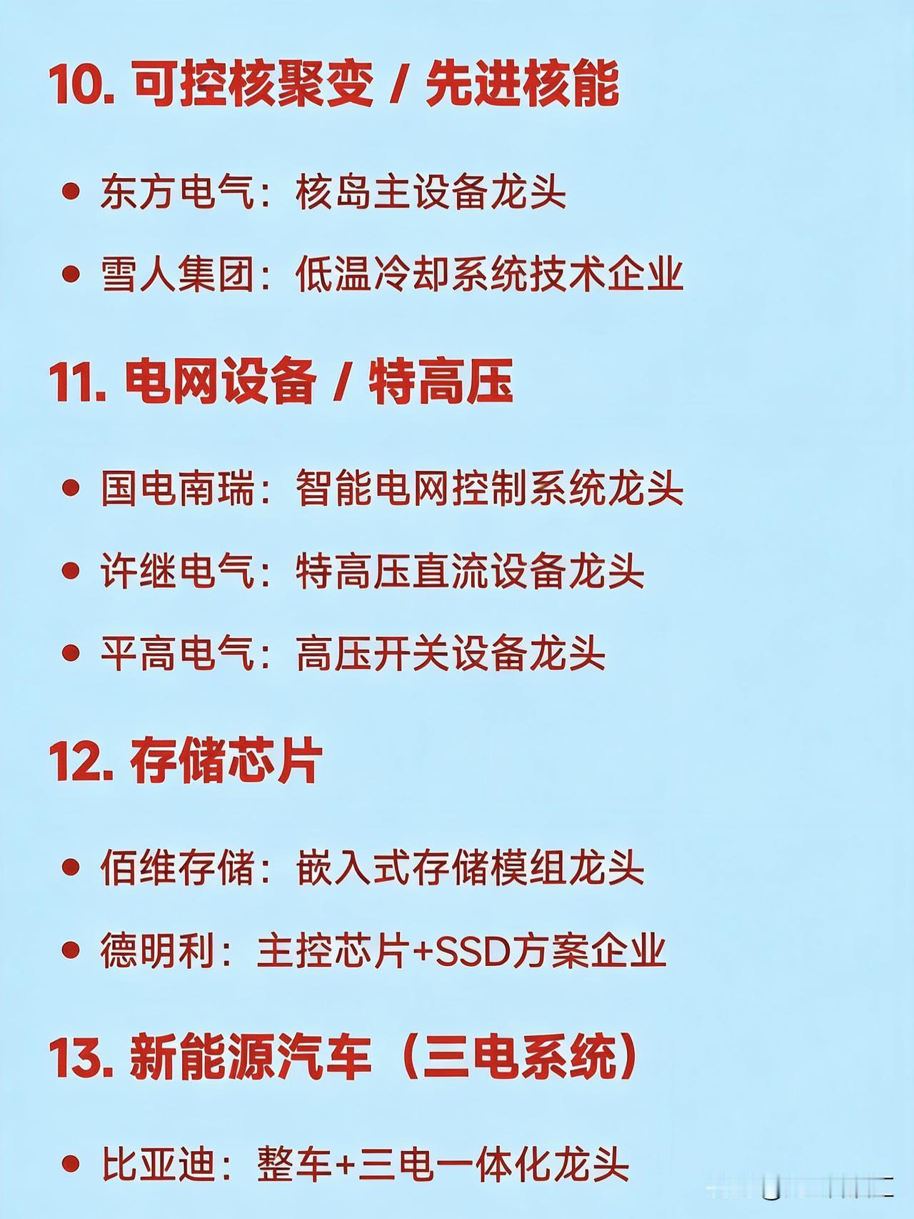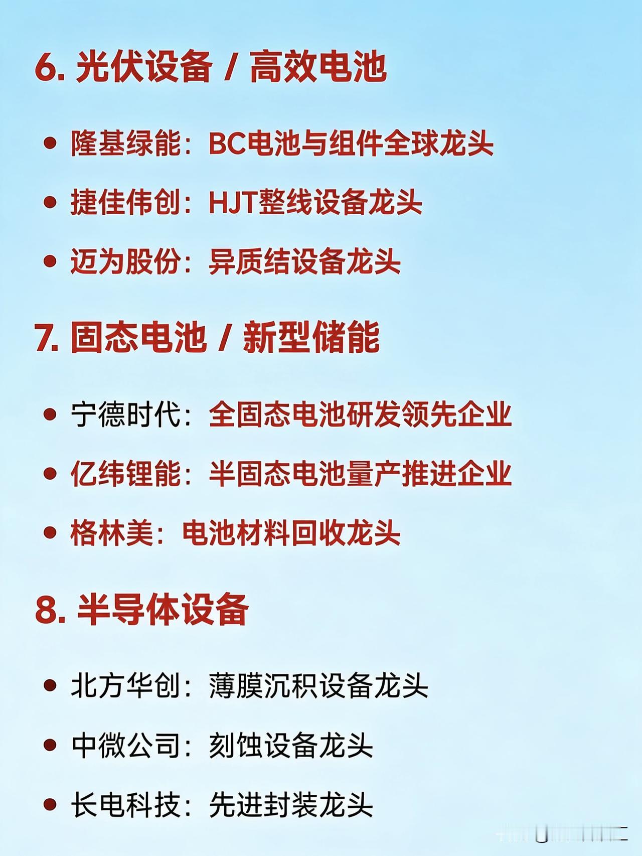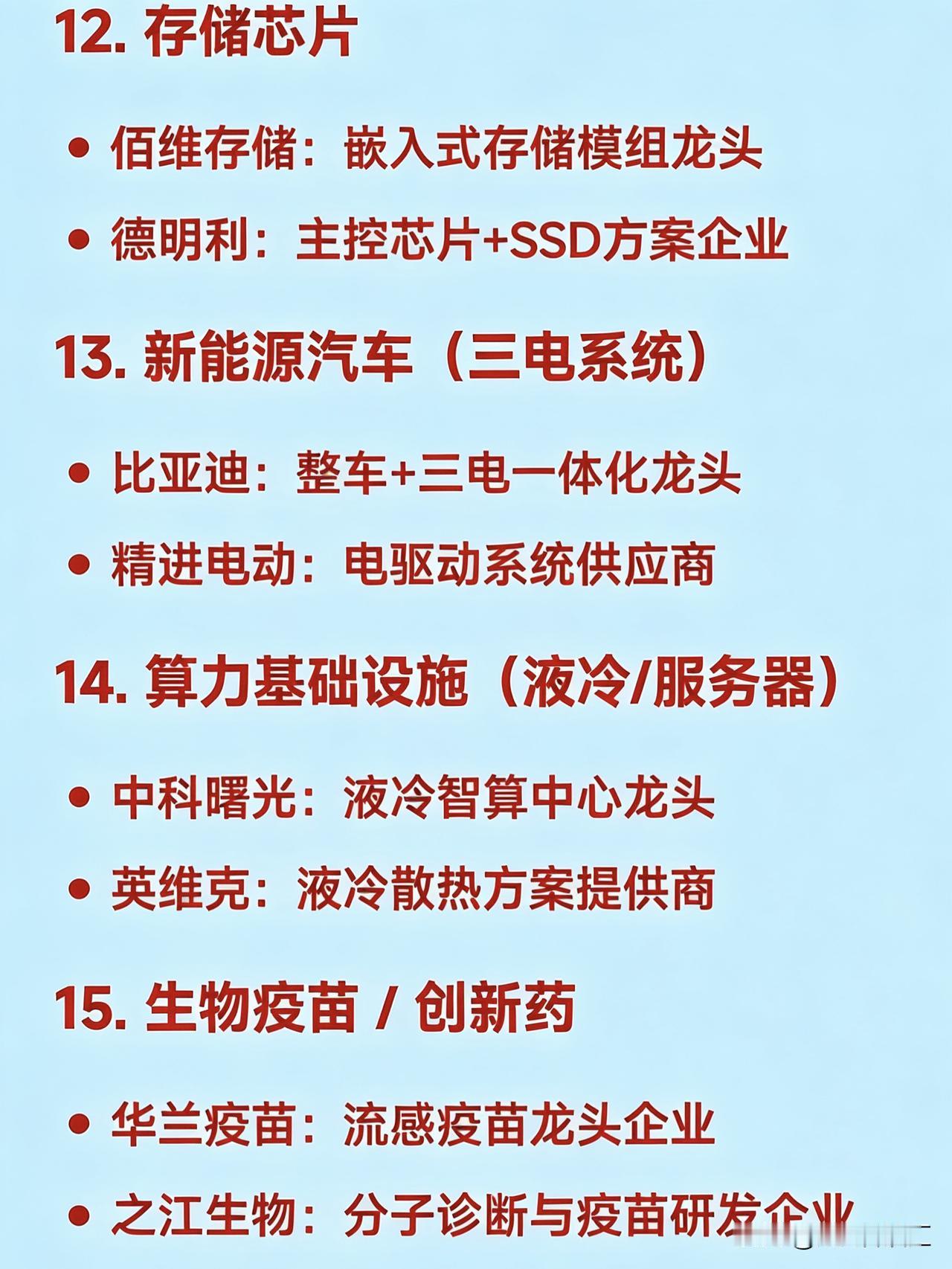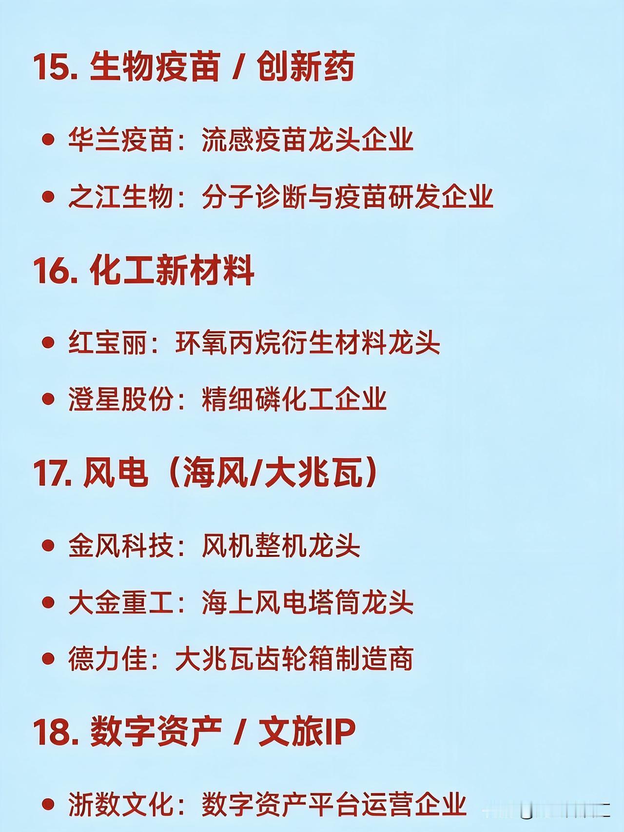 2026年1月26日二十大热点概念核心企业 1. 商业航天 航天电子:卫星配套系统龙头 中国卫星:卫星总体研制龙头 巨力索具:火箭结构件龙头 中超控股:航天连接器龙头 超捷股份:火箭箭体制造龙头 2. 钙钛矿电池 东方日升:钙钛矿+HJT叠层技术领先企业 拓日新能:钙钛矿电池研发代表企业 协鑫集成:钙钛矿组件一体化企业 钧达股份:高效电池+钙钛矿布局企业 3. 人形机器人 天奇股份:春晚机器人合作生态企业 绿的谐波:谐波减速器龙头 三花智控:一体化关节执行器龙头 汇川技术:伺服系统龙头 兆威机电:微型传动与灵巧手龙头 4. AI应用(智能体/营销) 利欧股份:AI数字营销与智能体落地企业 蓝色光标:AIGC内容生成与营销龙头 岩山科技:AI智能体平台企业 5. 贵金属(黄金/白银) 白银有色:白银冶炼综合龙头 湖南白银:伴生银资源企业 山东黄金:黄金采掘龙头企业 6. 光伏设备 / 高效电池 隆基绿能:BC电池与组件全球龙头 捷佳伟创:HJT整线设备龙头 迈为股份:异质结设备龙头 7. 固态电池 / 新型储能 宁德时代:全固态电池研发领先企业 亿纬锂能:半固态电池量产推进企业 格林美:电池材料回收龙头 8. 半导体设备 北方华创:薄膜沉积设备龙头 中微公司:刻蚀设备龙头 长电科技:先进封装龙头 9. 低空经济(eVTOL/无人机) 万丰奥威:eVTOL整机制造预期企业 光启技术:超材料机体结构供应商 10. 可控核聚变 / 先进核能 东方电气:核岛主设备龙头 雪人集团:低温冷却系统技术企业 11. 电网设备 / 特高压 国电南瑞:智能电网控制系统龙头 许继电气:特高压直流设备龙头 平高电气:高压开关设备龙头 12. 存储芯片 佰维存储:嵌入式存储模组龙头 德明利:主控芯片+SSD方案企业 13. 新能源汽车(三电系统) 比亚迪:整车+三电一体化龙头 精进电动:电驱动系统供应商 14. 算力基础设施(液冷/服务器) 中科曙光:液冷智算中心龙头 英维克:液冷散热方案提供商 15. 生物疫苗 / 创新药 华兰疫苗:流感疫苗龙头企业 之江生物:分子诊断与疫苗研发企业 16. 化工新材料 红宝丽:环氧丙烷衍生材料龙头 澄星股份:精细磷化工企业 17. 风电(海风/大兆瓦) 金风科技:风机整机龙头 大金重工:海上风电塔筒龙头 德力佳:大兆瓦齿轮箱制造商 18. 数字资产 / 文旅IP 浙数文化:数字资产平台运营企业 中文在线:IP内容+数字版权企业 19. 油气服务 杰瑞股份:油田技术服务龙头 石化机械:油气装备制造商 20. 消费电子(光学/传感器) 信维通信:天线与射频模组龙头 奥比中光:3D视觉传感器企业