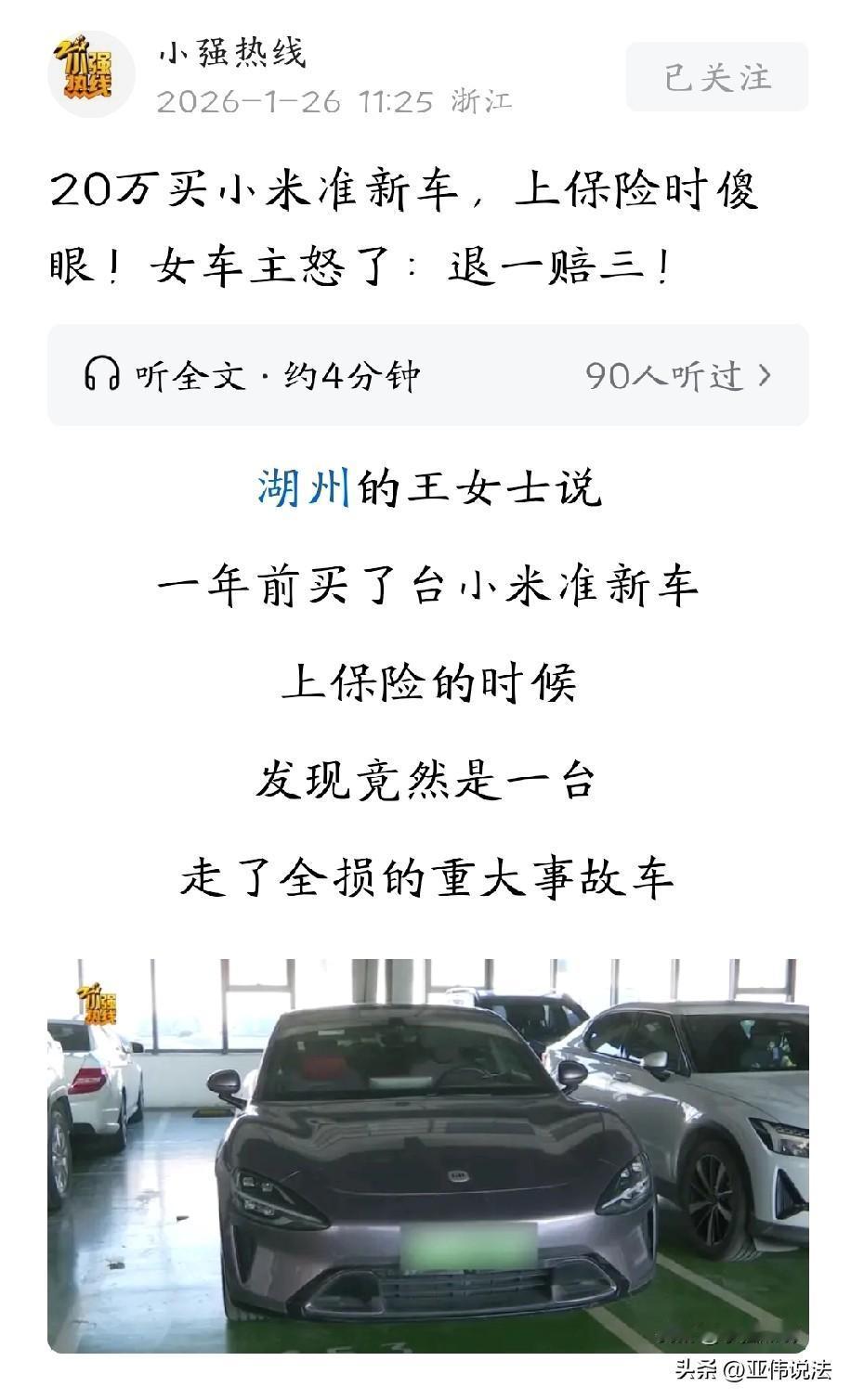 浙江杭州,女子花20.5万购买了一辆小米准新车,车行告诉女子,这辆车只跑了4000公里,发生过一点小事故,只需要给保险杠喷个漆就行,划算的很。女子以为捡到了便宜,高高兴兴去给车辆上保险,却被告知,这辆车发生过严重的事故,已经属于全损车。女子这才意识到自己被骗了,要求车行退一赔三,不料,车行早已人去楼空,市监局找不到车行法人,公安机关也不给立案。 一年前,王女士想着买辆性价比高的车,在华浙汽车产业园的某车行看中了一台小米SU7。 车行工作人员跟她说,这是台准新车,才跑了4000公里,原价大概22万,现在只要20.5万就能拿下。 毕竟是二手车,王女士仔细询问了车辆的事故情况。 车行工作人员拍着胸脯保证,车子就发生过一点小事故,顶多给保险杠喷个漆就行,算下来特别划算。 王女士一听,觉得这真是捡着便宜了,心里美滋滋的,没多犹豫就付了钱,签了购车合同。 当时她也有点不放心,在聊天里跟车行提过想看车辆事故报告,可对方没正面回应,只反复说就是保险杠做过油漆,没别的问题。 王女士想着合同都签了,车行也这么说了,就没再深究,高高兴兴提了车。 等王女士去给车子上保险的时候,意外却来了。 保险公司的人跟她说,这台车不对劲,前面肯定出过严重事故。 进一步了解后,王女士彻底懵了,这台车不仅是重大碰撞事故车,还已经被保险公司按全损车回收拍卖过。 根据车辆当时的定损协议书显示,车辆残值163300元,保险公司赔付了227000元回收,从留存的照片能清楚看到车头受损严重。 明明是花准新车的钱,买的竟是台全损车,王女士又气又急,这才意识到被车行骗了。 她赶紧翻出当初的购车合同,发现里面确实写着“事故车”三个字,可车行当初明明只说是保险杠蹭了点漆的小碰撞,压根没提是这么严重的全损事故。 王女士觉得,车行这就是故意隐瞒真实车况,属于典型的欺诈,她要求车行按照《消费者权益保护法》的规定,给她退一赔三,并给她一个说法。 可等王女士找到华浙汽车产业园的某车行时,她当场傻了眼,车行早就人去楼空。 她赶紧找了市场监管局,工作人员联系了很久,也只回复了依据:说找不到车行法人,据其家人透露,法人因为涉嫌违法犯罪在监狱服刑。 王女士又去派出所报案,结果公安机关也不给立案。 王女士四处奔波维权,却一次次碰壁,她只能求助记者。 记者陪着王女士再次来到华浙汽车产业园,没想到,园区工作人员表示,他们也在找这家车行,这家车行欠了他们20多万房租,去年1月27号就突然消失了。 工作人员还透露,多方打听后得知,车行法定代表人可能涉及经济纠纷,有职务侵占的情况,现在人在监狱里,他老婆也不管这事,让想维权的人直接起诉。 如今车行跑路,负责人联系不上,维权路难上加难。 王女士接下来只能通过法律途径继续维权,争取自己的合法权益。 本想便宜买个准新车,没成想,车行却拿着全损车忽悠她,面对如此困境,王女士的维权道路注定道阻且长。