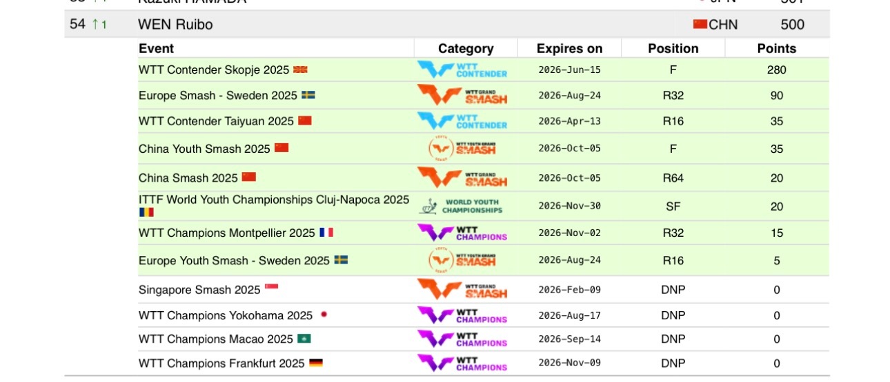 第5周世排积分变化(20260126期)【男单】🔺本周结算• WTT常规挑战赛